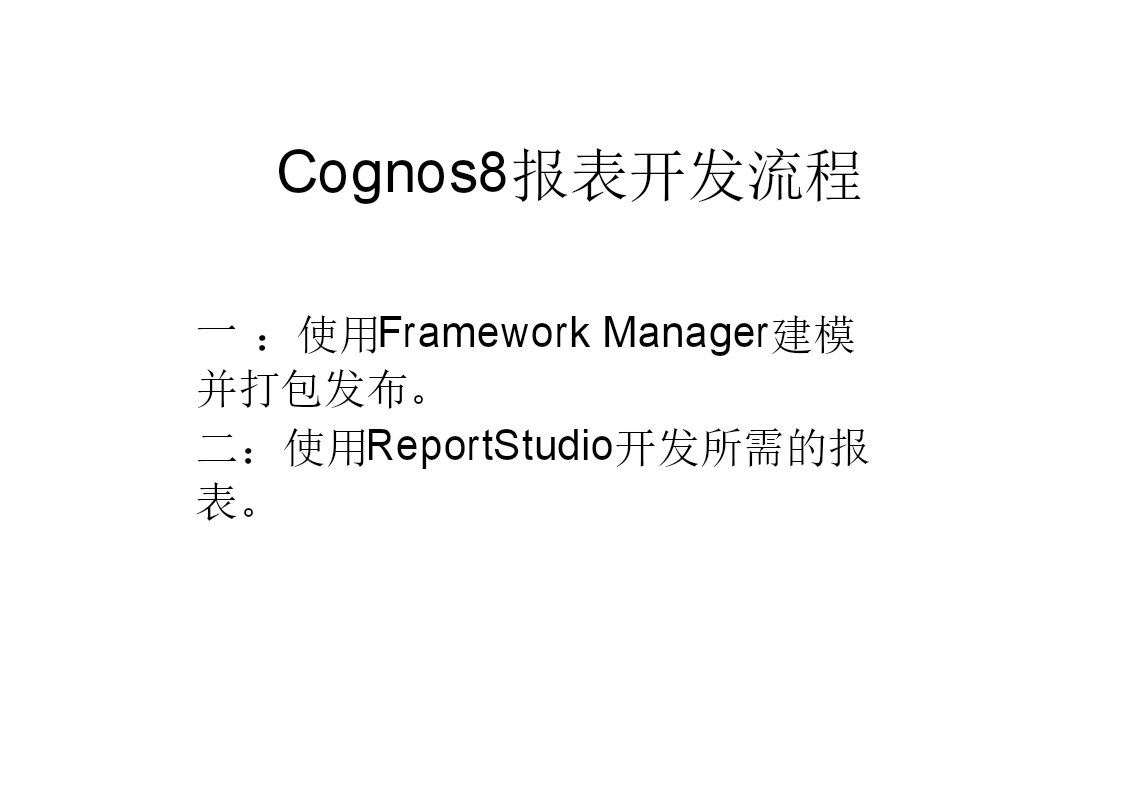 Cognos8报表开发流程一:使用FrameworkManager建模并打包发布。二:使用ReportStudio开发所需的报表。•FrameworkManager•1.建立工程文件,数据库连接•2.选择数据库表、列•3.建立针对数据库原始表的文件夹•4.建立数据表间的连接•5.根据业务要求创建查询•6.创建数据包,并发布到服务器1.建立工程文件,数据库连接2.选择数据库表、列选择数据库表及相应列3.建立针对数据库原始表的文件夹创建好文件夹后,将引入的数据库原始表加入此文件夹下,这样可以保持数据库原始态势