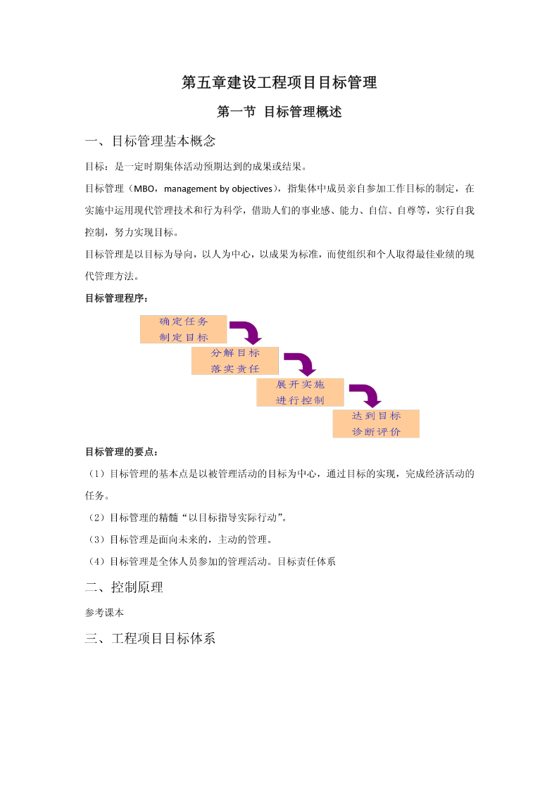 第五章建设工程项目目标管理第一节目标管理概述一、目标管理基本概念目标:是一定时期集体活动预期达到的成果或结果。目标管理(MBO,managementbyobjectives),指集体中成员亲自参加工作目标的制定,在实施中运用现代管理技术和行为科学,借助人们的事业感、能力、自信、自尊等,实行自我控制,努力实现目标。目标管理是以目标为导向,以人为中心,以成果为标准,而使组织和个人取得最佳业绩的现代管理方法。目标管理程序:目标管理的要点:(1)目标管理的基本点是以被管理活动的目标为中心,通过目标的实现,完成经济