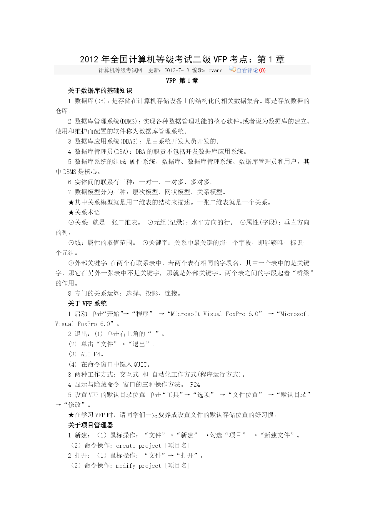 2012年全国计算机等级考试二级VFP考点:第1章HYPERLINK"http://edu.21cn.com/ncre"计算机等级考试网更新:2012-7-13编辑:evansHYPERLINK"http://edu.21cn.com/ncre/g_51_942724-1.htm"\l"lookall"查看评论(0)VFP第1章关于数据库的基础知识1数据库(DB):是存储在计算机存储设备上的结构化的相关数据集合。即是存放数据的仓库。2数据库管理系统(DBMS):实现各种数据管理功能的核心软件。