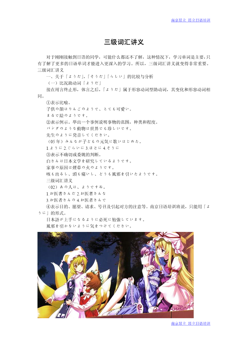 南京昂立昂立日语培训三级词汇讲义对于刚刚接触到日语的同学,可能什么都还不了解,这种情况下,学习单词是主要,只有了解了更多的日语单词才能进入更深入的学习。所以,三级词汇讲义就变得非常重要。三级词汇讲义一、关于「ようだ」,「そうだ」「らしい」的比较与分析(一)比况助动词「ようだ」接在用言终止形,体言之后,「ようだ」属于形容动词型助动词,其变化和形容动词相同。①表示比喻。子供の顔はりんごのようで、とても可愛い。まるで絵のようです。②表示例示。举出一个事例说明事物的范围,种类和程度。パンダのような動物は世界でも珍