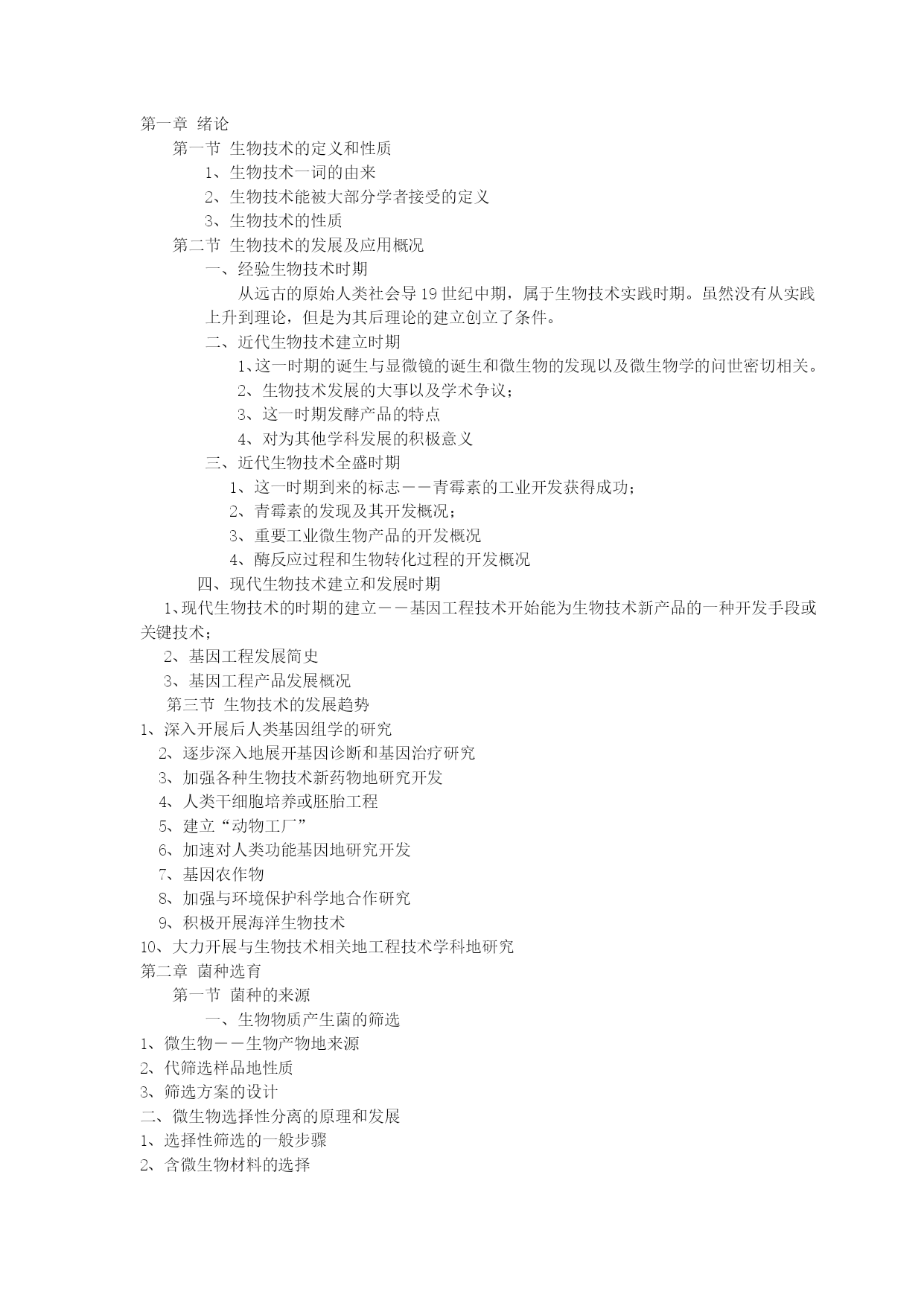 第一章绪论第一节生物技术的定义和性质1、生物技术一词的由来2、生物技术能被大部分学者接受的定义3、生物技术的性质第二节生物技术的发展及应用概况一、经验生物技术时期从远古的原始人类社会导19世纪中期,属于生物技术实践时期。虽然没有从实践上升到理论,但是为其后理论的建立创立了条件。二、近代生物技术建立时期1、这一时期的诞生与显微镜的诞生和微生物的发现以及微生物学的问世密切相关。2、生物技术发展的大事以及学术争议;3、这一时期发酵产品的特点4、对为其他学科发展的积极意义三、近代生物技术全盛时期1、这一时期到来的