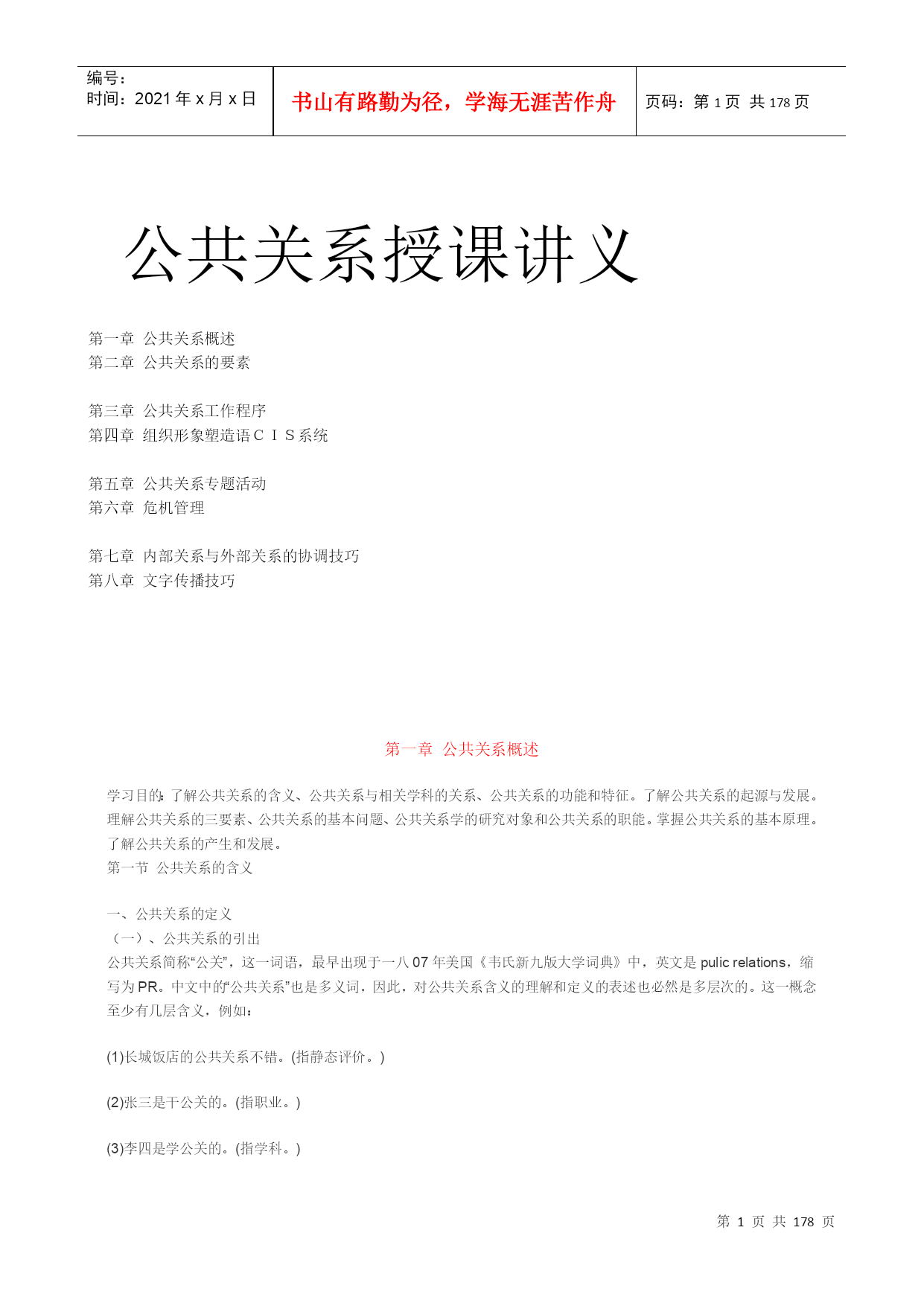 编号:时间:2021年x月x日书山有路勤为径,学海无涯苦作舟页码:第PAGE178页共NUMPAGES178页第PAGE\*MERGEFORMAT178页共NUMPAGES\*MERGEFORMAT178页公共关系授课讲义第一章公共关系概述第二章公共关系的要素第三章公共关系工作程序第四章组织形象塑造语CIS系统第五章公共关系专题活动第六章危机管理第七章内部关系与外部关系的协调技巧第八章文字传播技巧第一章公共关系概述学习目的:了解公共关系的含义、公共关系与相关学科的关系、公共关系的功