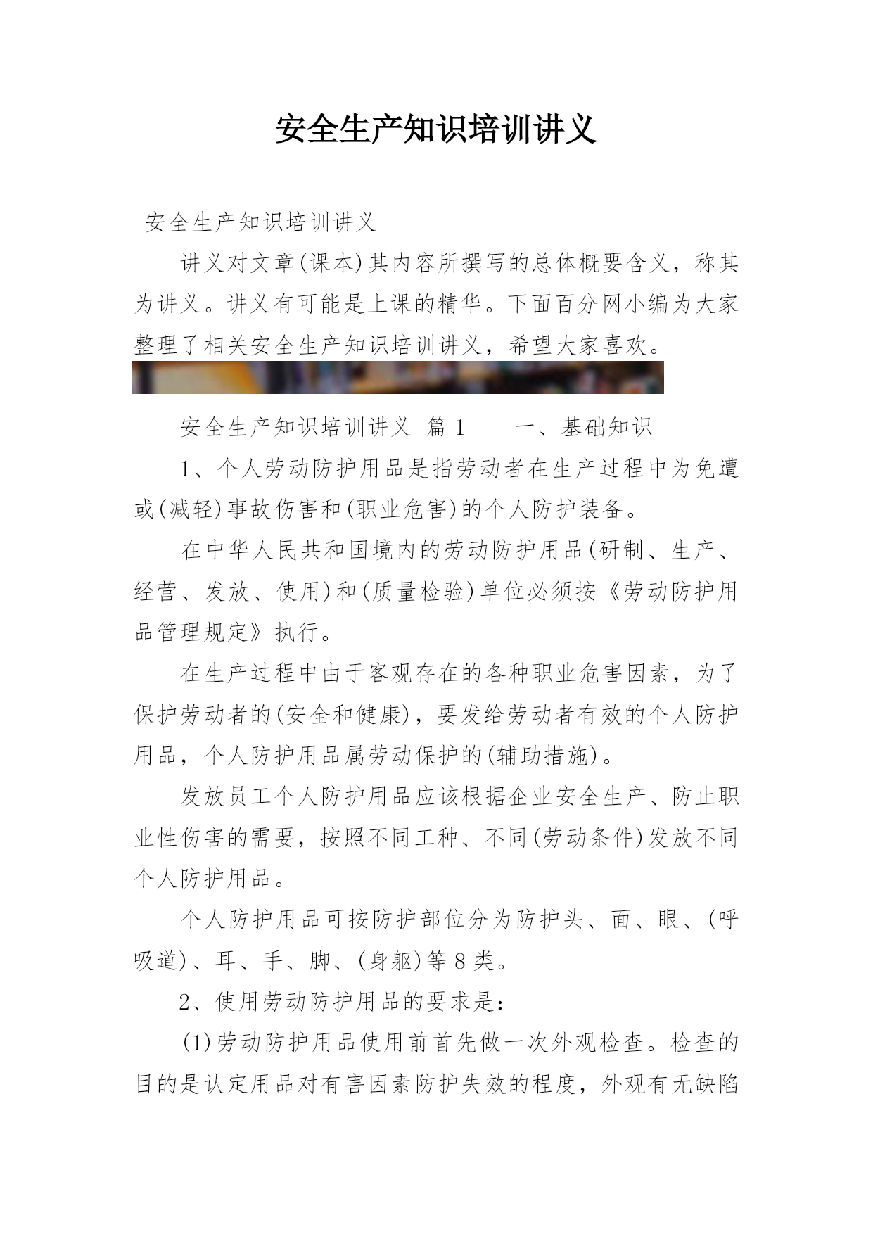 安全生产知识培训讲义安全生产知识培训讲义讲义对文章(课本)其内容所撰写的总体概要含义,称其为讲义。讲义有可能是上课的精华。下面百分网小编为大家整理了相关安全生产知识培训讲义,希望大家喜欢。安全生产知识培训讲义篇1一、基础知识1、个人劳动防护用品是指劳动者在生产过程中为免遭或(减轻)事故伤害和(职业危害)的个人防护装备。在中华人民共和国境内的劳动防护用品(研制、生产、经营、发放、使用)和(质量检验)单位必须按《劳动防护用品管理规定》执行。在生产过程中由于客观存在的各种职业危害因素,为了保护劳动者的(安全和健