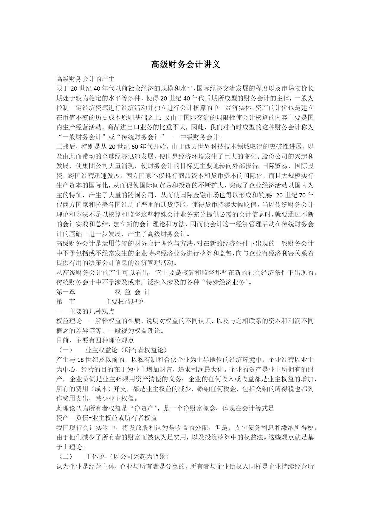 高级财务会计讲义高级财务会计的产生限于20世纪40年代以前社会经济的规模和水平,国际经济交流发展的程度以及市场物价长期处于较为稳定的水平等条件,使得20世纪40年代后期所成型的财务会计的主体,一般为控制一定经济资源进行经济活动并独立进行会计核算的单一经济实体,资产的计价也是建立在币值不变的历史成本原则基础之上;又由于国际交流的局限性使会计核算的内容主要是国内生产经营活动,商品进出口业务的比重不大,因此,我们对当时成型的这种财务会计称为“一般财务会计”或“传统财务会计”——中级财务会计。二战后,特别是从20