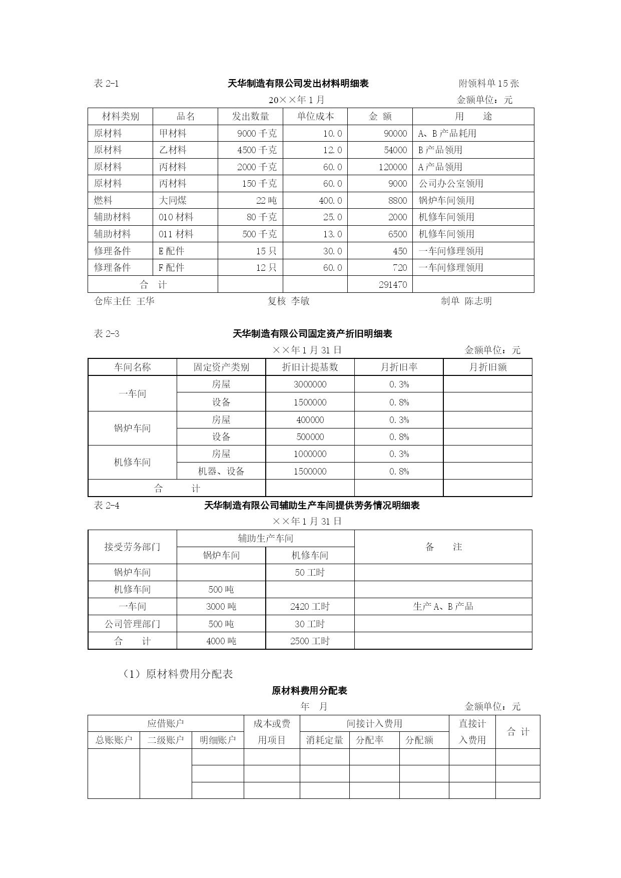 表2-1天华制造有限公司发出材料明细表附领料单15张20××年1月金额单位:元材料类别品名发出数量单位成本金额用途原材料甲材料9000千克10.090000A、B产品耗用原材料乙材料4500千克12.054000B产品领用原材料丙材料2000千克60.0120000A产品领用原材料丙材料150千克60.09000公司办公室领用燃料大同煤22吨400.08800锅炉车间领用辅助材料010材料80千克25.02000机修车间领用辅助材料011材料500千克13.06500机修车间领用修理备件E配件15只30.