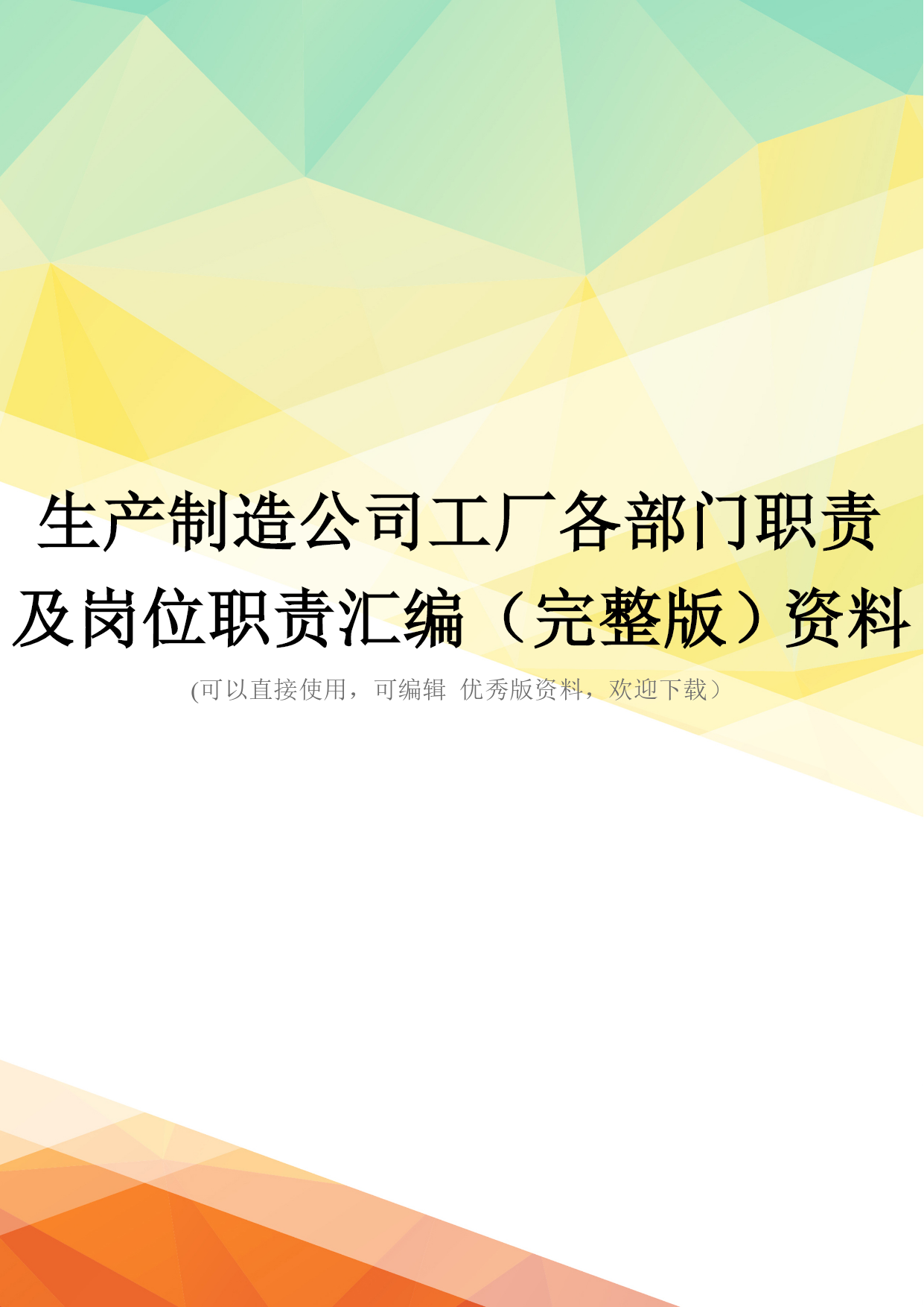 生产制造公司工厂各部门职责及岗位职责汇编(完整版)资料(可以直接使用,可编辑优秀版资料,欢迎下载)生产部职责生产部在生产部经理的直接领导下,全面负责公司的生产管理工作;1、根据公司要求,合理组织人员及物料的调度安排,按时完成公司下达的各项生产任务;2、充分调动生产人员的积极性和创造性,做好公司生产计划的执行工作;3、对生产过程中的重大生产技术问题、质量问题进行分析与解决;4、负责生产车间的各类报表的汇总分析工作;5、负责生产车间设备的购置申请、设备验收以及日常的维护与保养等;6、积极做好生产岗位员工的工作