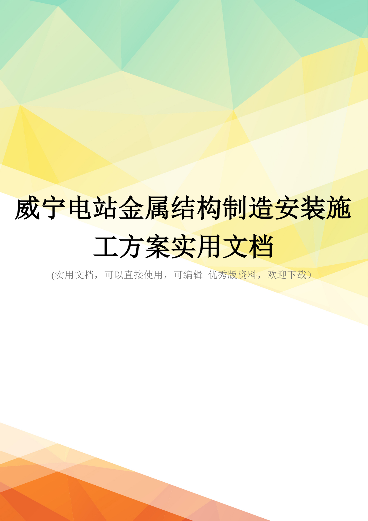 威宁电站金属结构制造安装施工方案实用文档(实用文档,可以直接使用,可编辑优秀版资料,欢迎下载)威宁电站金属结构制造安装施工方案本钢矿建公司2007。5。13威宁电站金属结构制造安装施工方案一、工程概况及特点1.工程地点:该工程位于本溪市境内太子河中游威宁段。2。工程主要内容:该工程金属结构主要施工内容包括:泄洪工作闸门一扇及埋件一套共32.。8T;泄洪检修闸门一扇及埋件一套共27.。68T;电站厂房进口快速闸门四扇及埋件四套共44.6T;电站厂房出口检修闸门一扇及埋件四套共23.3T;电站厂房进口拦污栅四