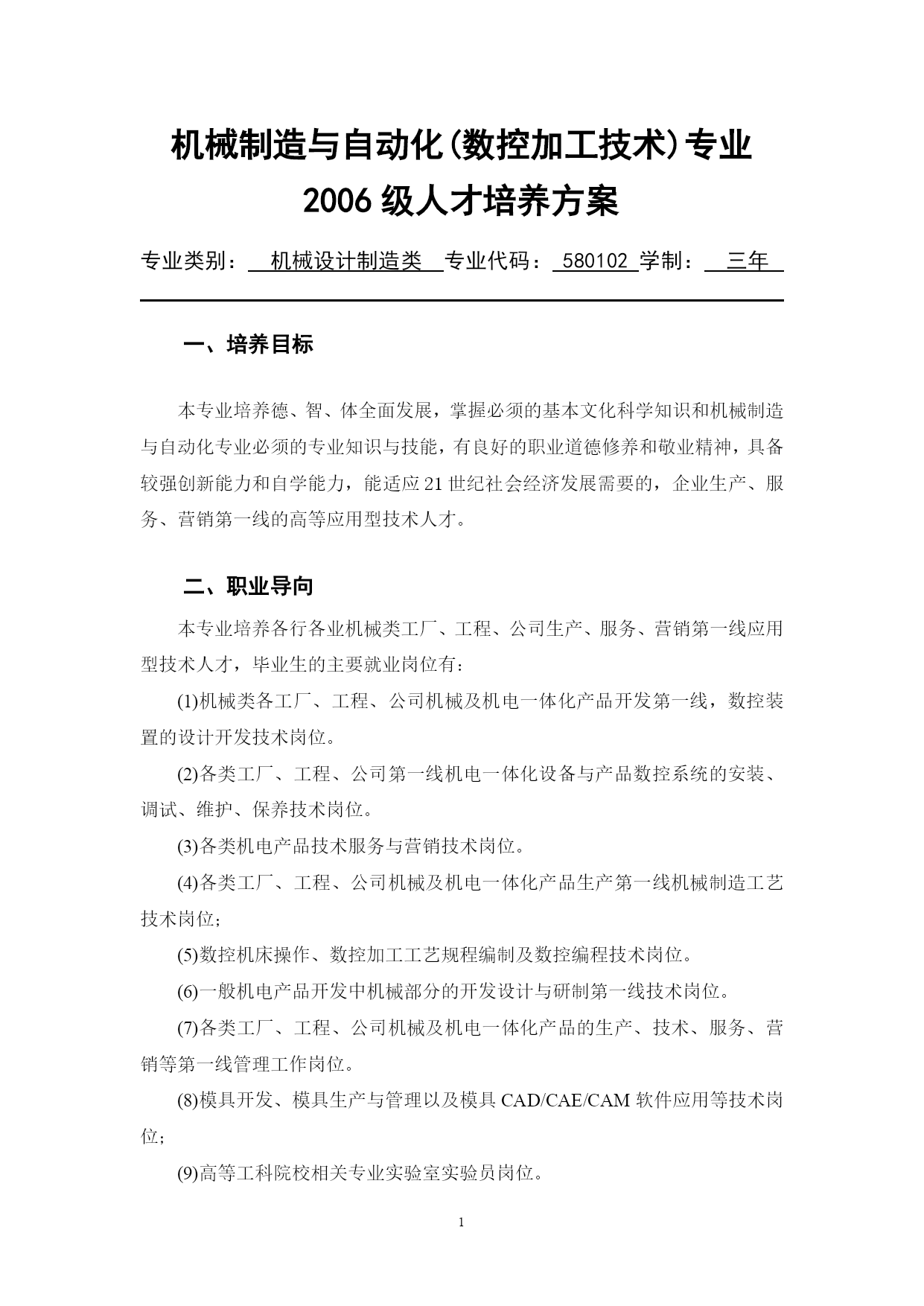 PAGEPAGE13机械制造与自动化(数控加工技术)专业2006级人才培养方案专业类别:机械设计制造类专业代码:580102学制:三年一、培养目标本专业培养德、智、体全面发展,掌握必须的基本文化科学知识和机械制造与自动化专业必须的专业知识与技能,有良好的职业道德修养和敬业精神,具备较强创新能力和自学能力,能适应21世纪社会经济发展需要的,企业生产、服务、营销第一线的高等应用型技术人才。二、职业导向本专业培养各行各业机械类工厂、工程、公司生产、服务、营销第一线应用型技术人才,毕业生的主要就业岗位