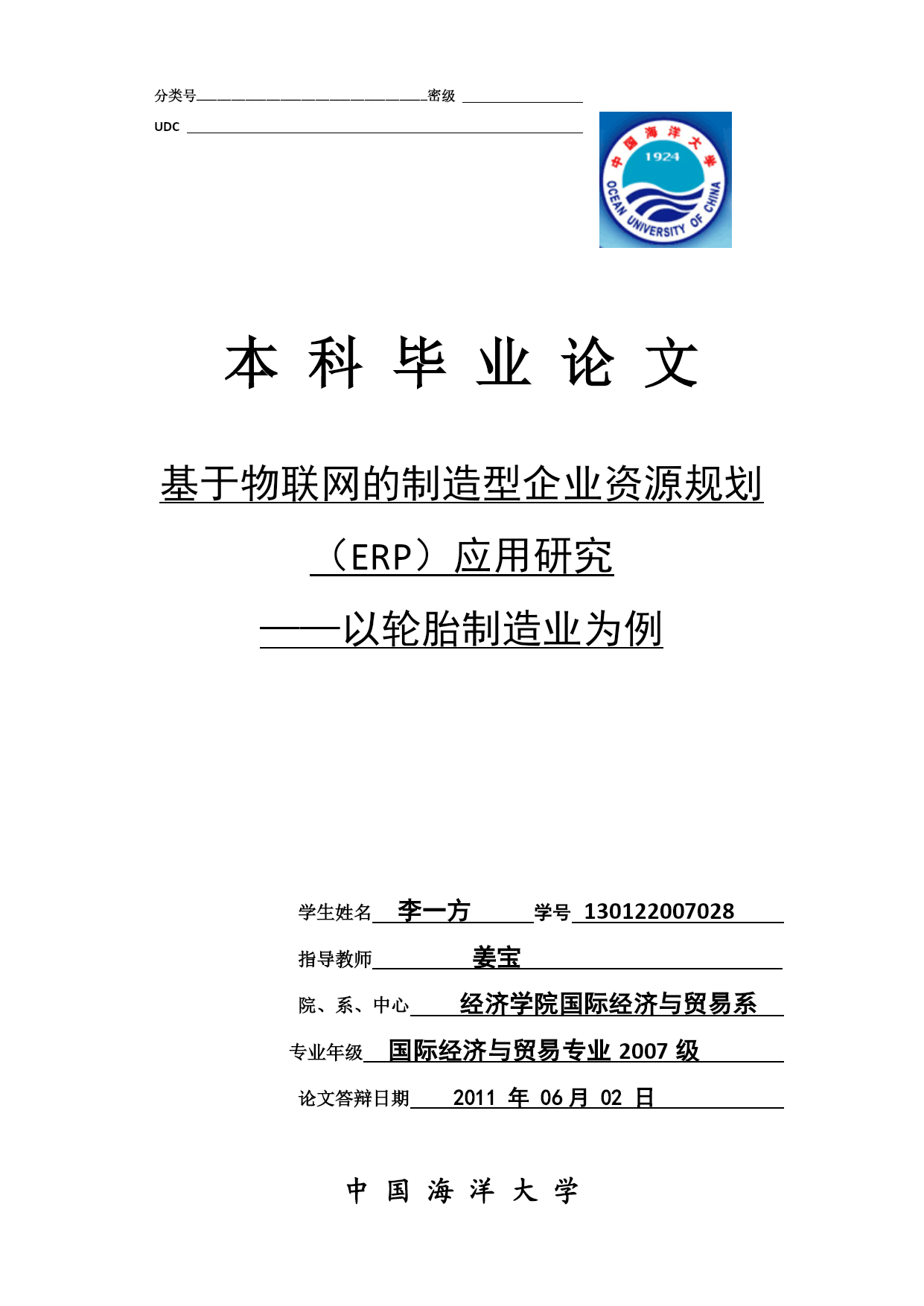 分类号—————————————————————————————————密级UDC本科毕业论文基于物联网的制造型企业资源规划(ERP)应用研究——以轮胎制造业为例学生姓名李一方学号130122007028指导教师姜宝院、系、中心经济学院国际经济与贸易系专业年级国际经济与贸易专业2007级论文答辩日期2011年06月02日中国海洋大学基于物联网的制造型企业资源规划(ERP)应用研究摘要【摘要正文】现代企业处在信息化的大环境中,充分利用先进技术进行企业资源管理规划,反映了时代对企业合理调配资源、最大化地创造社