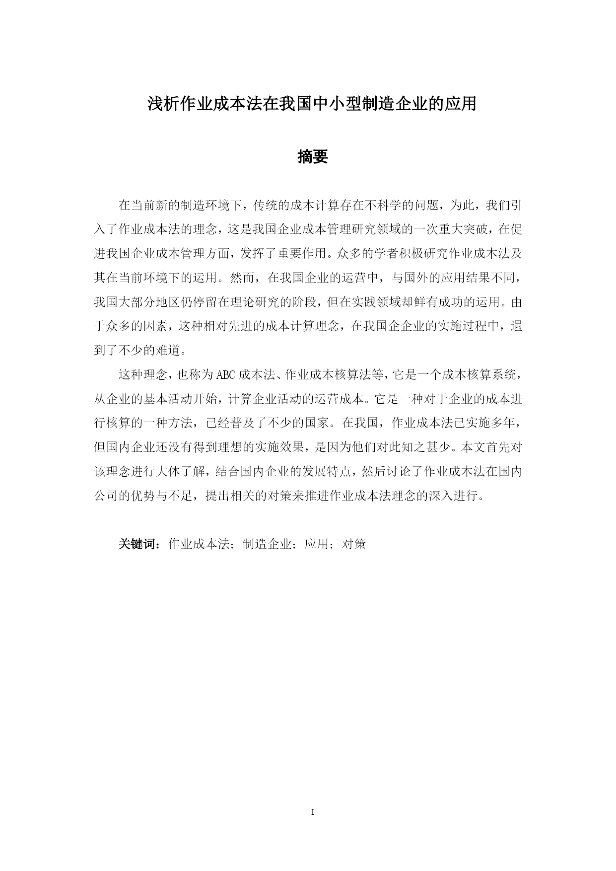 PAGE\*MERGEFORMATI浅析作业成本法在我国中小型制造企业的应用摘要在当前新的制造环境下,传统的成本计算存在不科学的问题,为此,我们引入了作业成本法的理念,这是我国企业成本管理研究领域的一次重大突破,在促进我国企业成本管理方面,发挥了重要作用。众多的学者积极研究作业成本法及其在当前环境下的运用。然而,在我国企业的运营中,与国外的应用结果不同,我国大部分地区仍停留在理论研究的阶段,但在实践领域却鲜有成功的运用。由于众多的因素,这种相对先进的成本计算理念,在我国企企业的实施过程中,遇到了不少