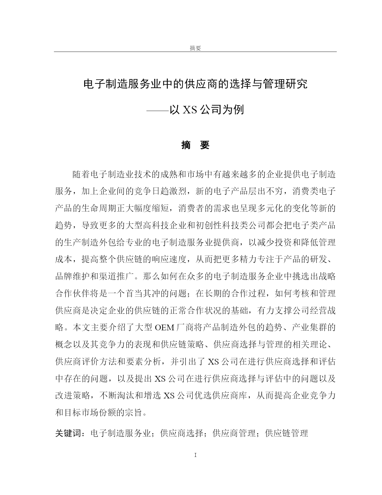 摘要PAGE\*MERGEFORMATI电子制造服务业中的供应商的选择与管理研究——以XS公司为例摘要随着电子制造业技术的成熟和市场中有越来越多的企业提供电子制造服务,加上企业间的竞争日趋激烈,新的电子产品层出不穷,消费类电子产品的生命周期正大幅度缩短,消费者的需求也呈现多元化的变化等新的趋势,导致更多的大型高科技企业和初创性科技类公司都会把电子类产品的生产制造外包给专业的电子制造服务业提供商,以减少投资和降低管理成本,提高整个供应链的响应速度,从而把更多精力专注于产品的研发、品牌维护和渠道推广。那
