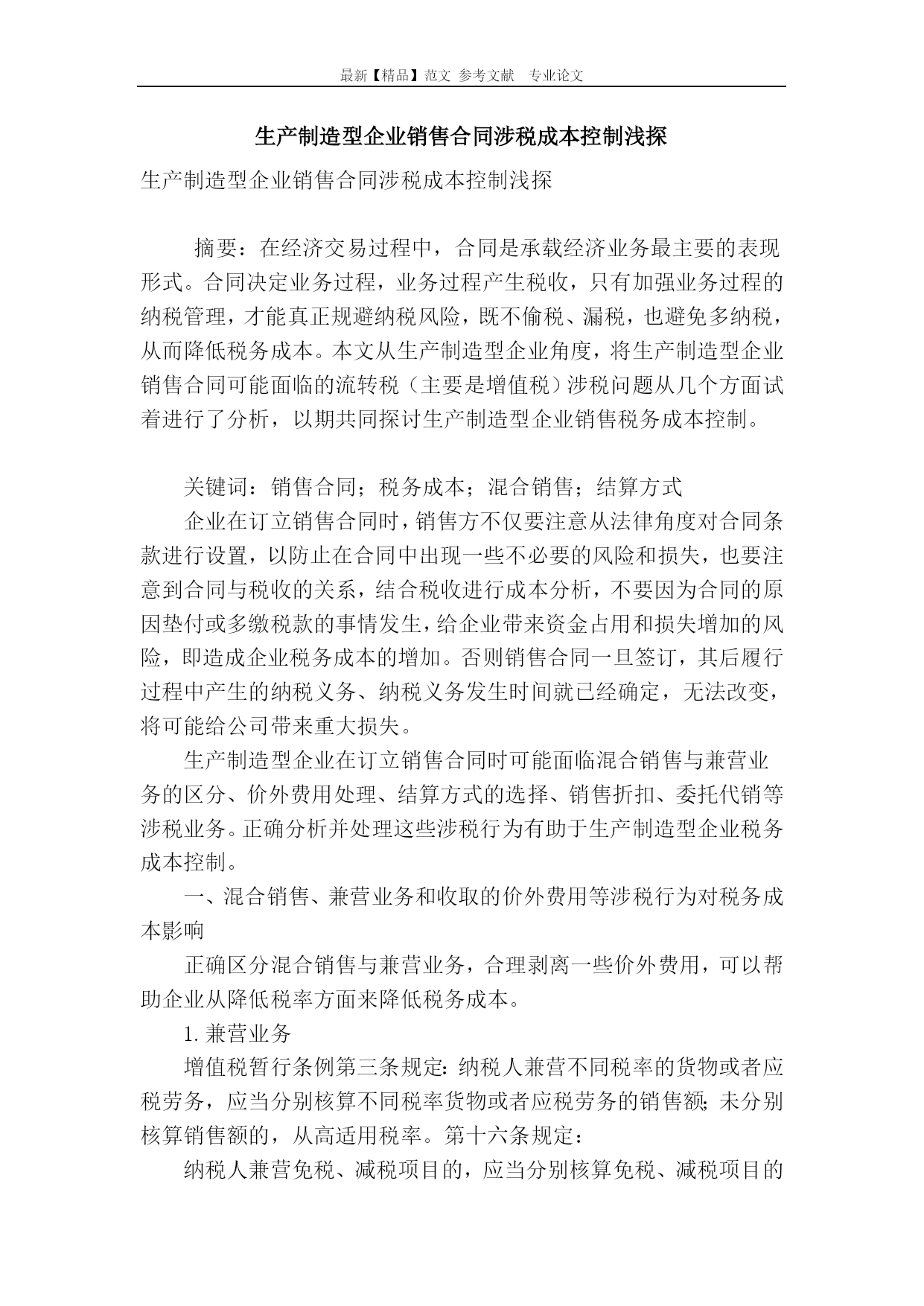 最新【精品】范文参考文献专业论文生产制造型企业销售合同涉税成本控制浅探生产制造型企业销售合同涉税成本控制浅探摘要:在经济交易过程中,合同是承载经济业务最主要的表现形式。合同决定业务过程,业务过程产生税收,只有加强业务过程的纳税管理,才能真正规避纳税风险,既不偷税、漏税,也避免多纳税,从而降低税务成本。本文从生产制造型企业角度,将生产制造型企业销售合同可能面临的流转税(主要是增值税)涉税问题从几个方面试着进行了分析,以期共同探讨生产制造型企业销售税务成本控制。关键词:销售合同;税务成本;混合销售;结算方式企