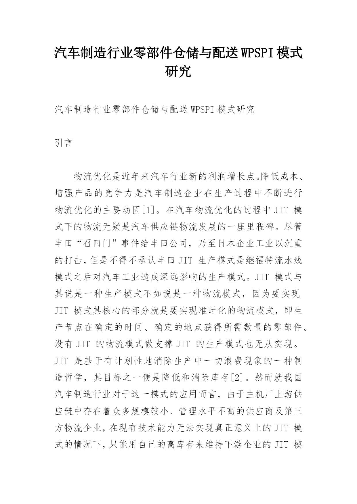 汽车制造行业零部件仓储与配送WPSPI模式研究汽车制造行业零部件仓储与配送WPSPI模式研究引言物流优化是近年来汽车行业新的利润增长点。降低成本、增强产品的竞争力是汽车制造企业在生产过程中不断进行物流优化的主要动因[1]。在汽车物流优化的过程中JIT模式下的物流无疑是汽车供应链物流发展的一座里程碑。尽管丰田“召回门”事件给丰田公司,乃至日本企业工业以沉重的打击,但是不得不承认丰田JIT生产模式是继福特流水线模式之后对汽车工业造成深远影响的生产模式。JIT模式与其说是一种生产模式不如说是一种物流模式,因为要