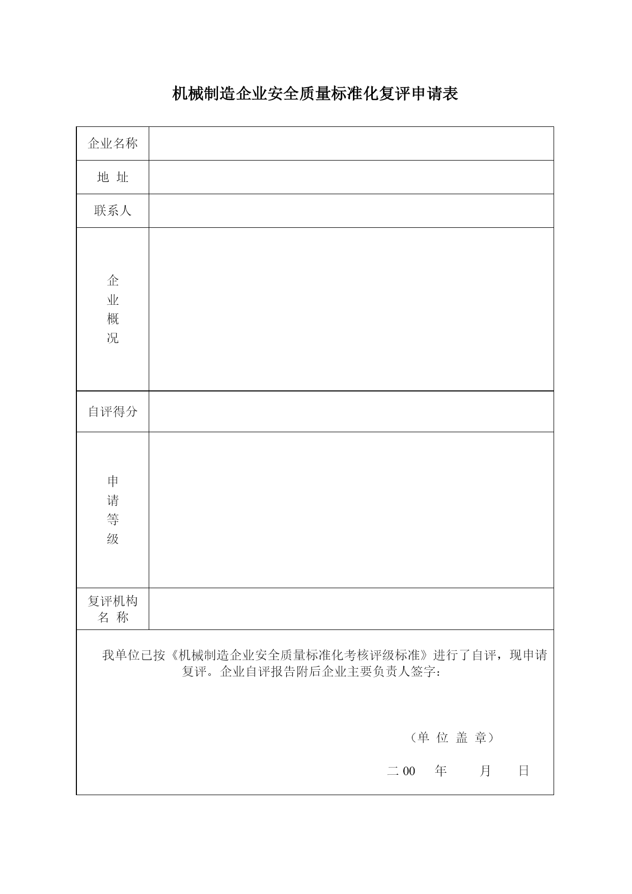 机械制造企业安全质量标准化复评申请表企业名称地址联系人企业概况自评得分申请等级复评机构名称我单位已按《机械制造企业安全质量标准化考核评级标准》进行了自评,现申请复评。企业自评报告附后企业主要负责人签字:(单位盖章)二00年月日机械制造企业安全质量标准化自评报告企业自评情况概述机械制造企业安全质量标准化自/复评汇总表序号考评内容应得分拥有总数量抽查数量抽查不合格数抽查不合格率实得分备注一、基础管理考评(合计应得分230,实得分分)1安全生产责任制152职业安全健康规章制度153规划与年度计划154机构与人员