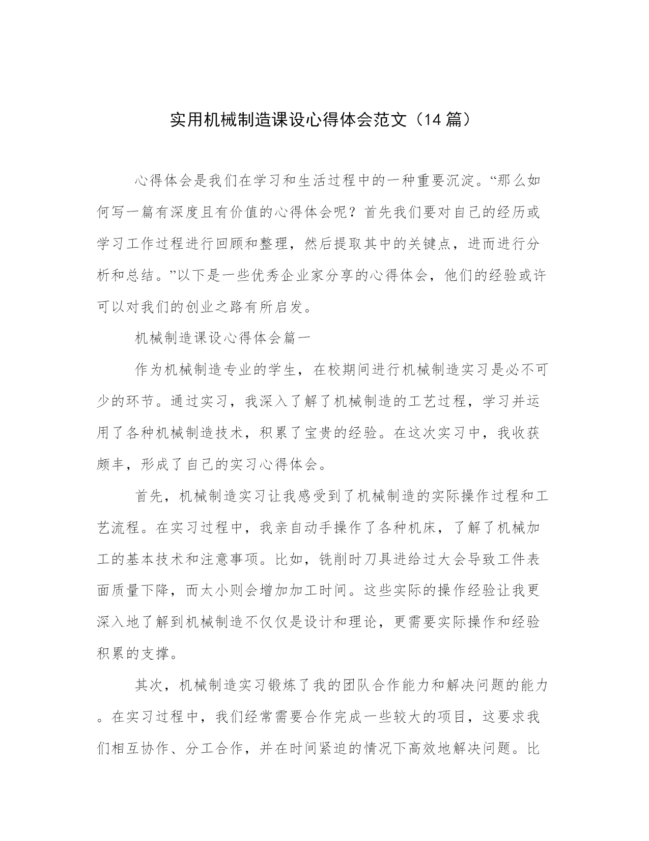 实用机械制造课设心得体会范文(14篇)心得体会是我们在学习和生活过程中的一种重要沉淀。“那么如何写一篇有深度且有价值的心得体会呢?首先我们要对自己的经历或学习工作过程进行回顾和整理,然后提取其中的关键点,进而进行分析和总结。”以下是一些优秀企业家分享的心得体会,他们的经验或许可以对我们的创业之路有所启发。机械制造课设心得体会篇一作为机械制造专业的学生,在校期间进行机械制造实习是必不可少的环节。通过实习,我深入了解了机械制造的工艺过程,学习并运用了各种机械制造技术,积累了宝贵的经验。在这次实习中,我收获颇丰