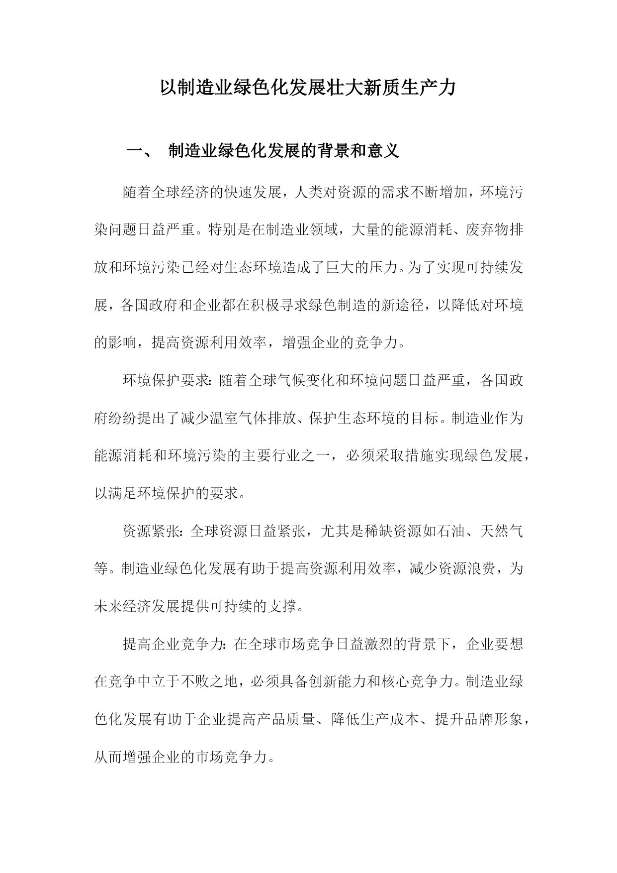 以制造业绿色化发展壮大新质生产力一、制造业绿色化发展的背景和意义随着全球经济的快速发展,人类对资源的需求不断增加,环境污染问题日益严重。特别是在制造业领域,大量的能源消耗、废弃物排放和环境污染已经对生态环境造成了巨大的压力。为了实现可持续发展,各国政府和企业都在积极寻求绿色制造的新途径,以降低对环境的影响,提高资源利用效率,增强企业的竞争力。环境保护要求:随着全球气候变化和环境问题日益严重,各国政府纷纷提出了减少温室气体排放、保护生态环境的目标。制造业作为能源消耗和环境污染的主要行业之一,必须采取措施实现