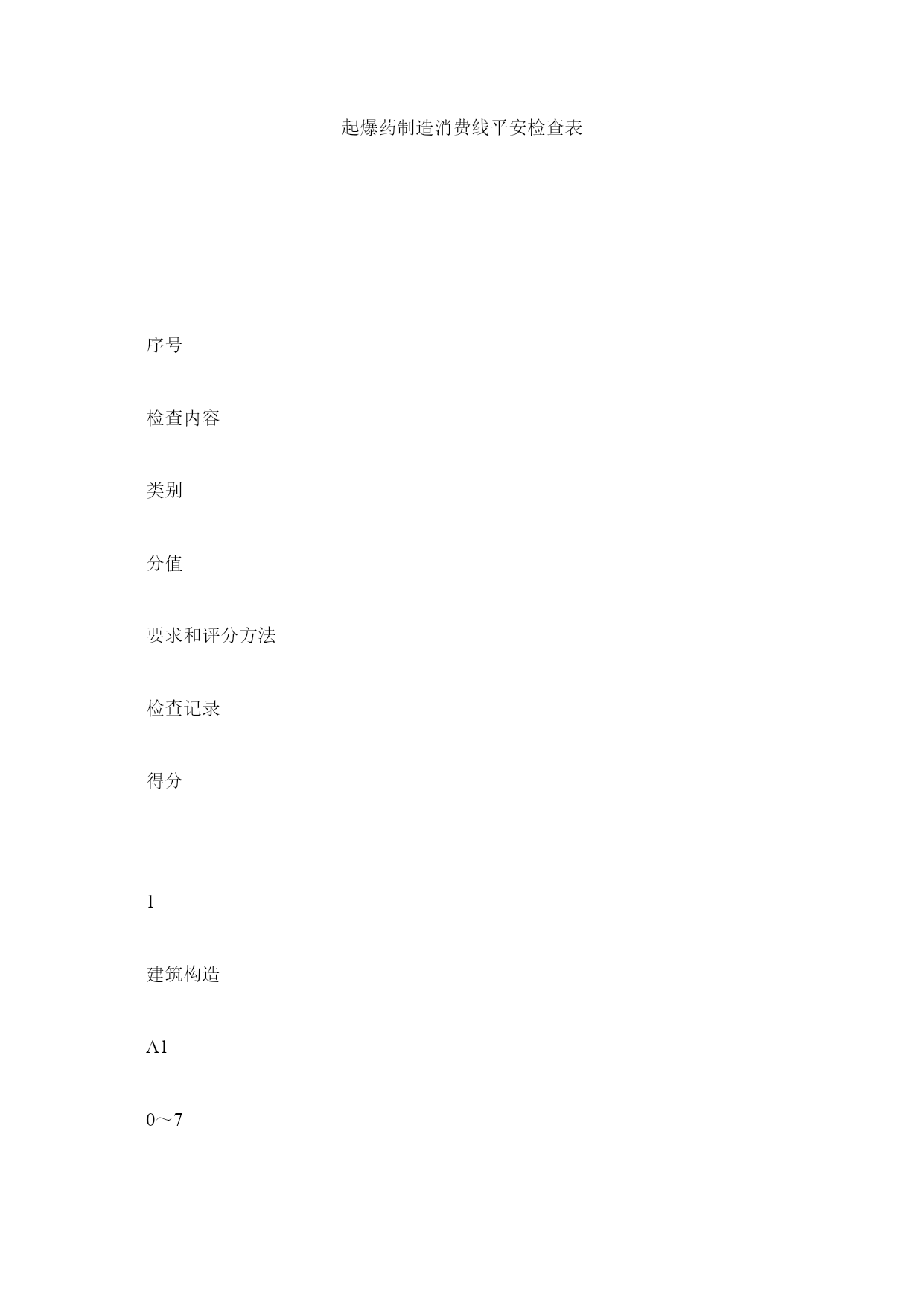 起爆药制造消费线平安检查表序号检查内容类别分值要求和评分方法检查记录得分1建筑构造A10~7a)A、B厂库房应到达二级耐火等级要求;b)最远工作点距出口的间隔,A、B级厂房不应超过15m;c)A级工房内不应设办公和辅助用室;d)门窗、地面符合要求。符合要求得7分;a)、b)、c)每项不合格扣3分,d)每项不合格扣2分。2工艺布置A20~7a)岗位的布置宜使任何地点的操作人员迅速疏散;b)起爆药等敏感炸药的单调应采纳热水;c)危险品中转库应单独设置;d)工艺布置流畅、无工序穿插或倒流运输。符合要求得7分;每