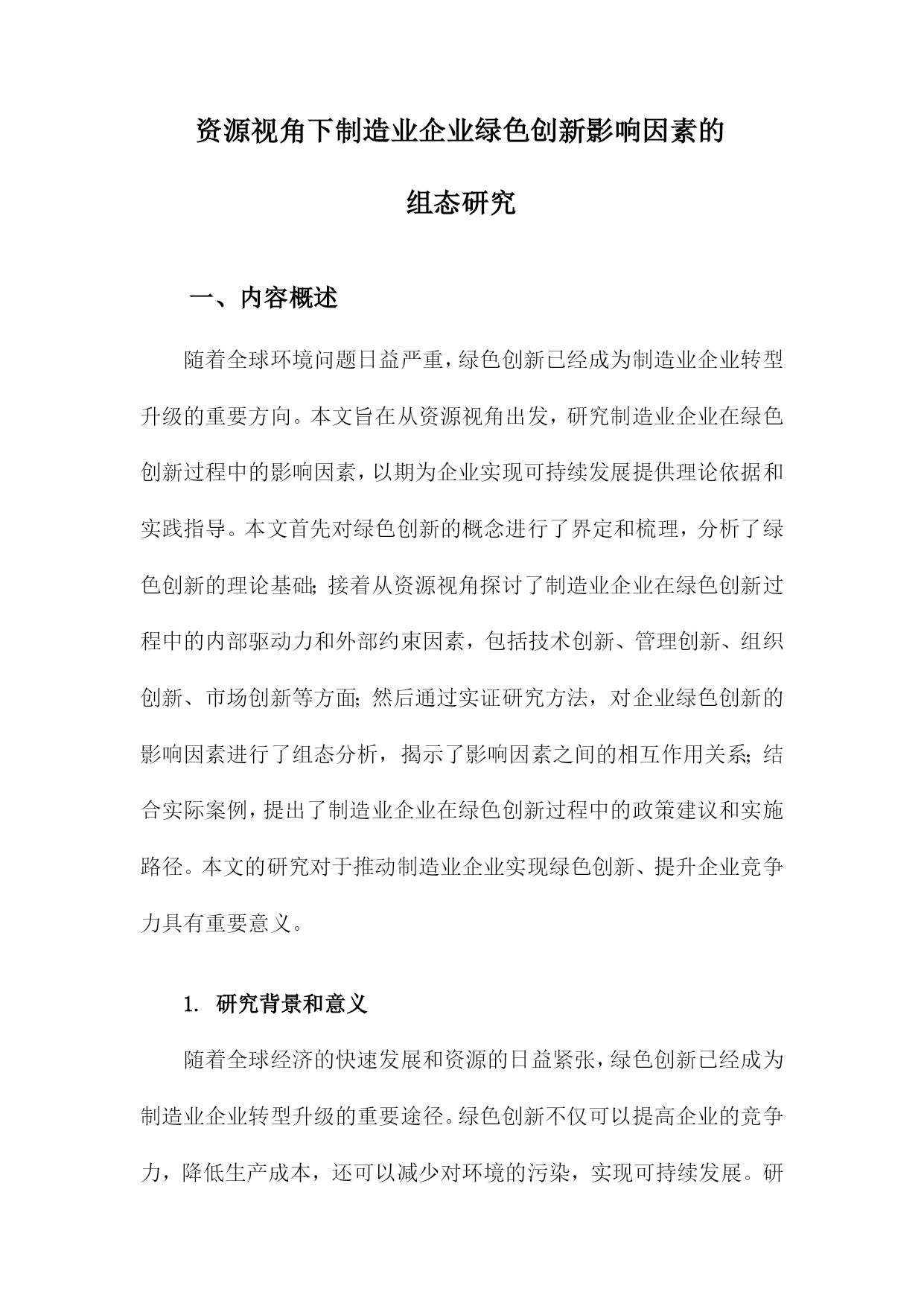 资源视角下制造业企业绿色创新影响因素的组态研究一、内容概述随着全球环境问题日益严重,绿色创新已经成为制造业企业转型升级的重要方向。本文旨在从资源视角出发,研究制造业企业在绿色创新过程中的影响因素,以期为企业实现可持续发展提供理论依据和实践指导。本文首先对绿色创新的概念进行了界定和梳理,分析了绿色创新的理论基础;接着从资源视角探讨了制造业企业在绿色创新过程中的内部驱动力和外部约束因素,包括技术创新、管理创新、组织创新、市场创新等方面;然后通过实证研究方法,对企业绿色创新的影响因素进行了组态分析,揭示了影响因