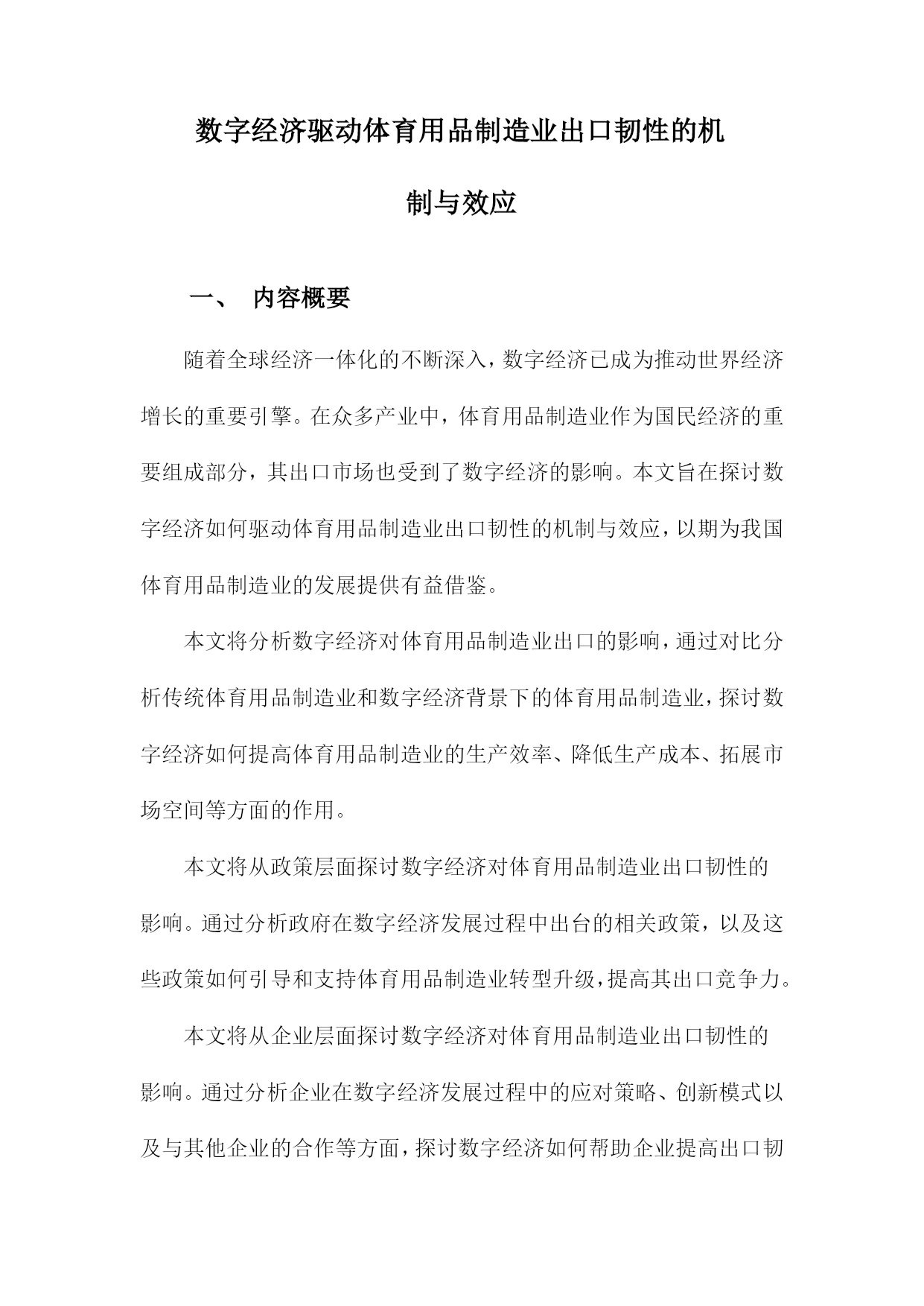 数字经济驱动体育用品制造业出口韧性的机制与效应一、内容概要随着全球经济一体化的不断深入,数字经济已成为推动世界经济增长的重要引擎。在众多产业中,体育用品制造业作为国民经济的重要组成部分,其出口市场也受到了数字经济的影响。本文旨在探讨数字经济如何驱动体育用品制造业出口韧性的机制与效应,以期为我国体育用品制造业的发展提供有益借鉴。本文将分析数字经济对体育用品制造业出口的影响,通过对比分析传统体育用品制造业和数字经济背景下的体育用品制造业,探讨数字经济如何提高体育用品制造业的生产效率、降低生产成本、拓展市场空间