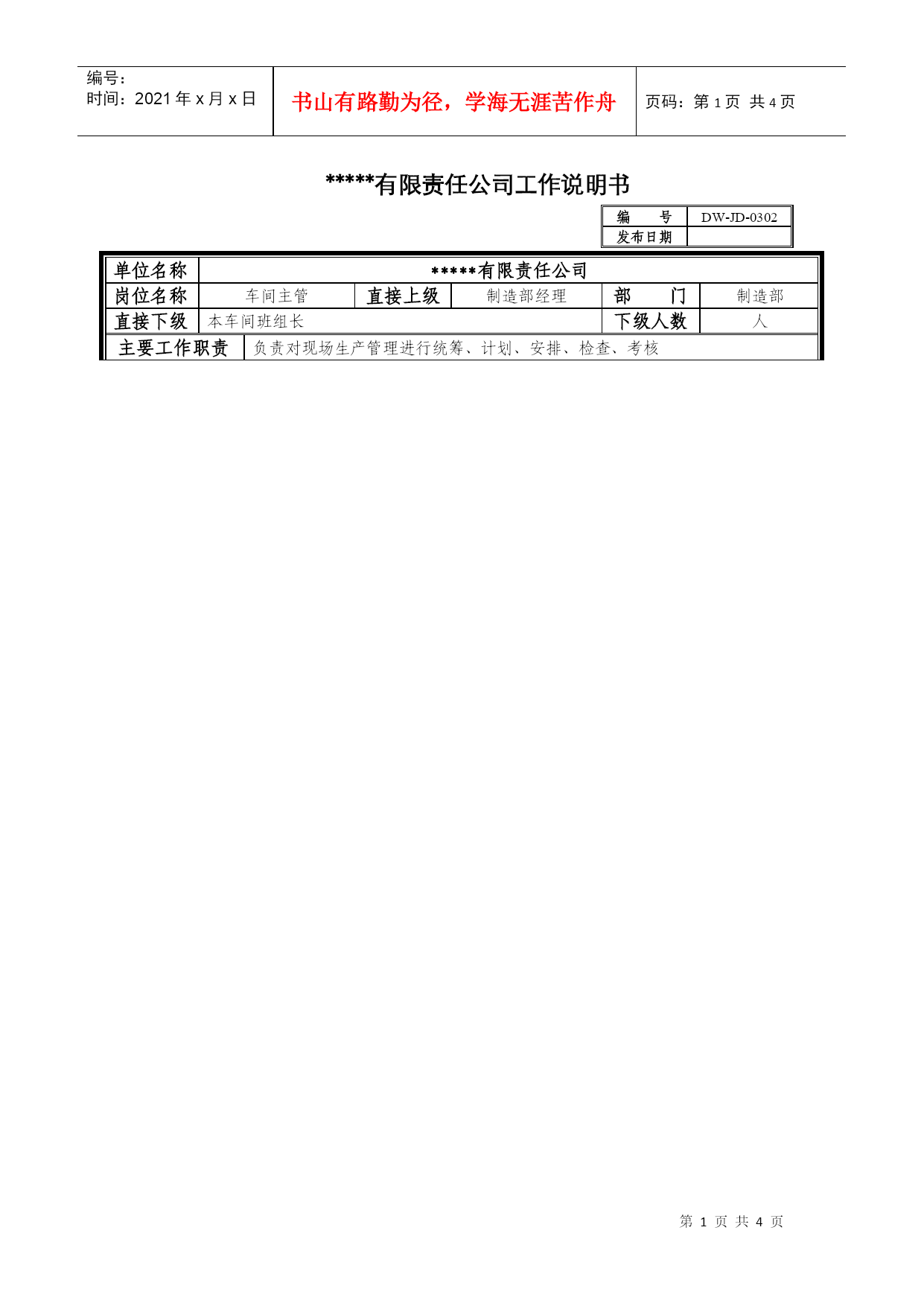编号:时间:2021年x月x日书山有路勤为径,学海无涯苦作舟页码:第PAGE4页共NUMPAGES4页第PAGE\*MERGEFORMAT4页共NUMPAGES\*MERGEFORMAT4页*****有限责任公司工作说明书编号DW-JD-0302发布日期单位名称*****有限责任公司岗位名称车间主管直接上级制造部经理部门制造部直接下级本车间班组长下级人数人主要工作职责负责对现场生产管理进行统筹、计划、安排、检查、考核工作内容制度的执行贯彻执行公司的各项规章制度,严守公司秘密,维护公
