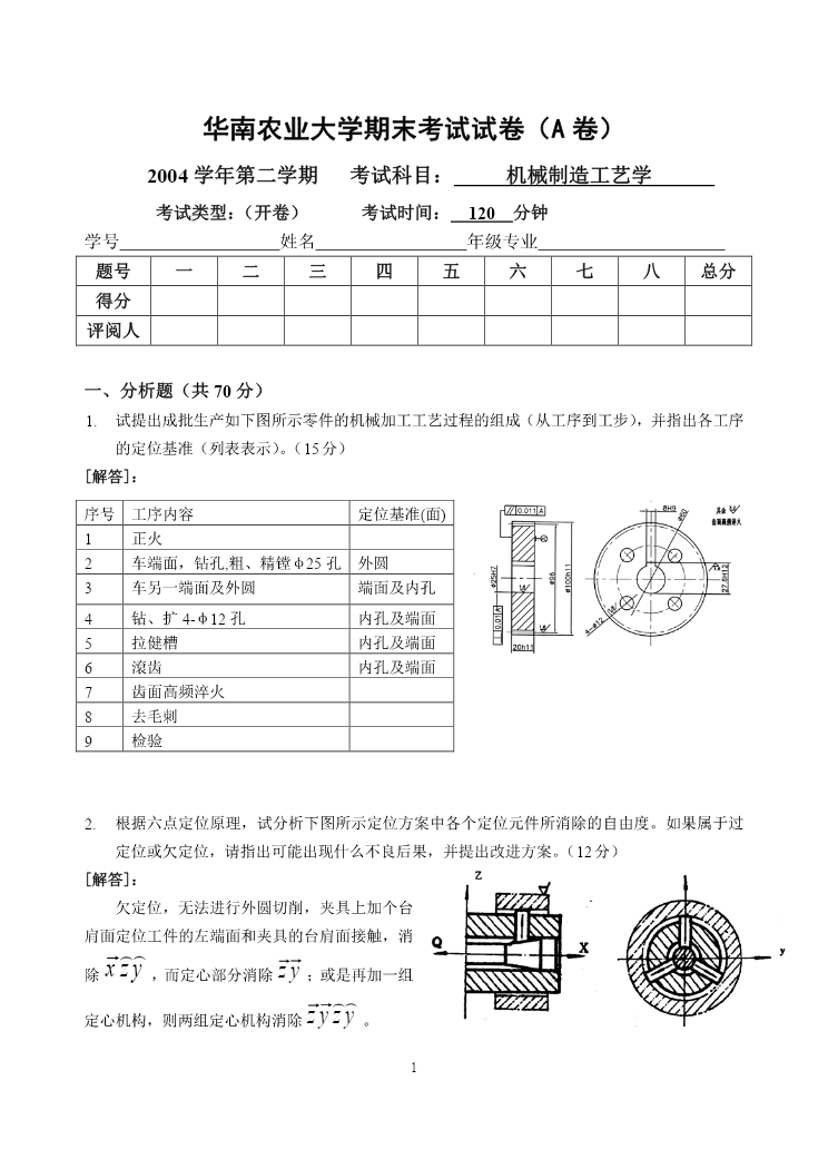 华南农业大学期末考试试卷(A卷)2004学年第二学期考试科目:机械制造工艺学考试类型:(开卷)考试时间:120分钟学号姓名年级专业题号一二三四五六七八总分得分评阅人一、分析题(共70分)1.试提出成批生产如下图所示零件的机械加工工艺过程的组成(从工序到工步),并指出各工序的定位基准(列表表示)。(15分)[解答]:序号工序内容定位基准(面)1正火2车端面,钻孔,粗、精镗φ25孔外圆3车另一端面及外圆端面及内孔4钻、扩4-φ12孔内孔及端面5拉健槽内孔及端面6滾齿内孔及端面7齿面高频淬火8去毛刺9检验2.根