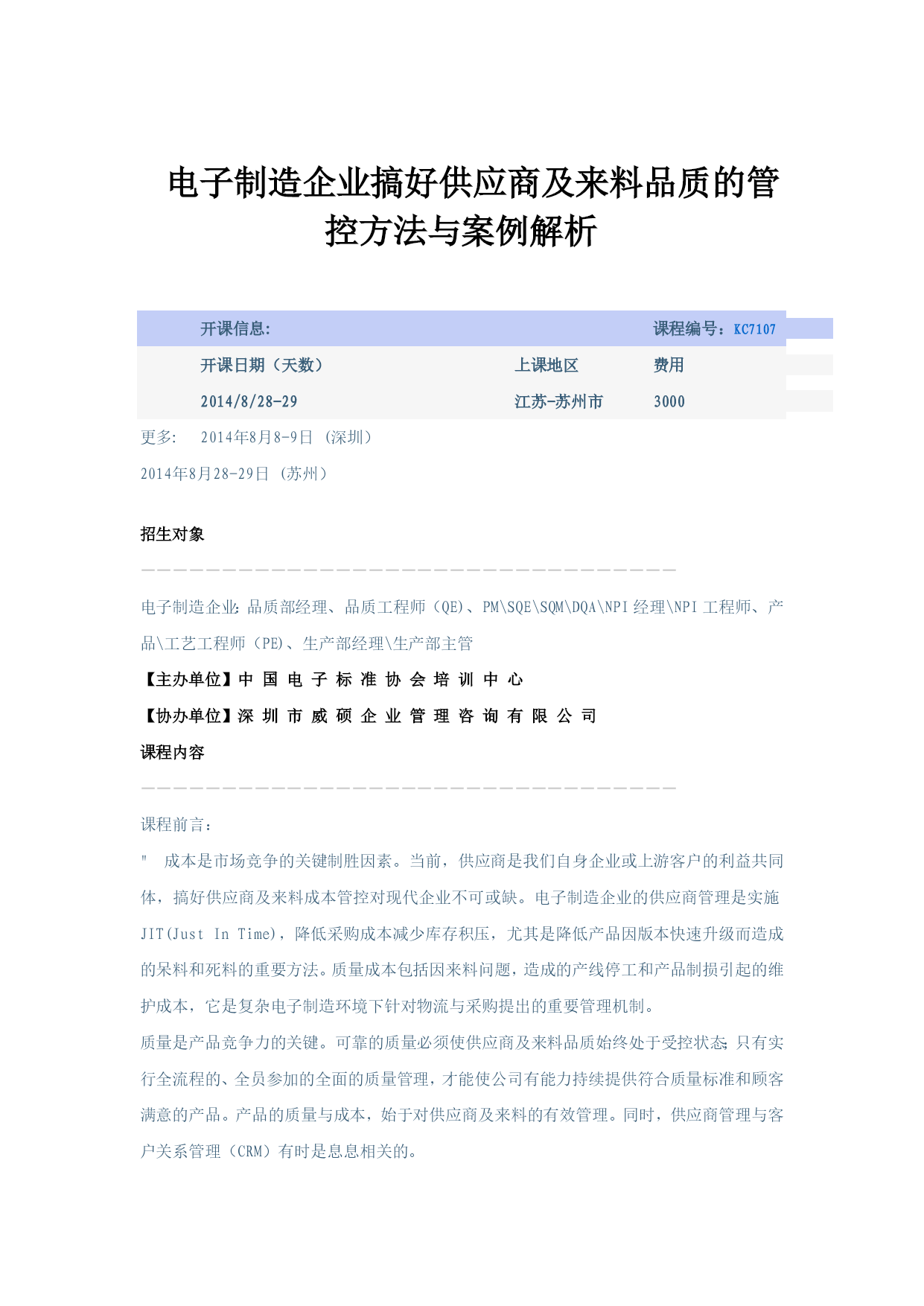 电子制造企业搞好供应商及来料品质的管控方法与案例解析开课信息:课程编号:KC7107开课日期(天数)上课地区费用2014/8/28-29江苏-苏州市3000更多:2014年8月8-9日(深圳)2014年8月28-29日(苏州)招生对象---------------------------------电子制造企业:品质部经理、品质工程师(QE)、PM\SQE\SQM\DQA\NPI经理\NPI工程师、产品\工艺工程师(PE)、生产部经理\生产部主管【主办单位】中国电子标准协会培训中心【协办单位】深圳市威硕企