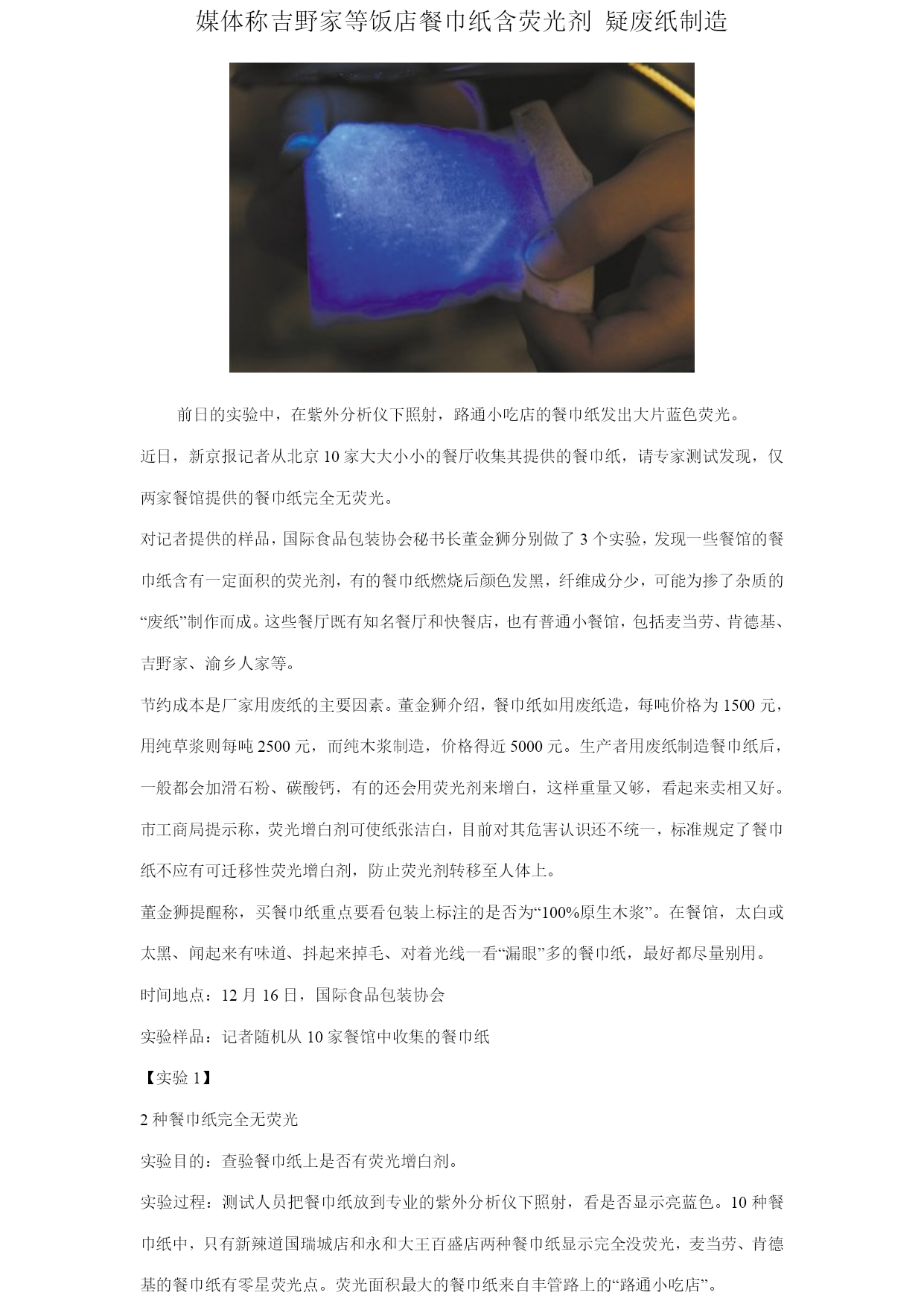 媒体称吉野家等饭店餐巾纸含荧光剂 疑废纸制造.doc