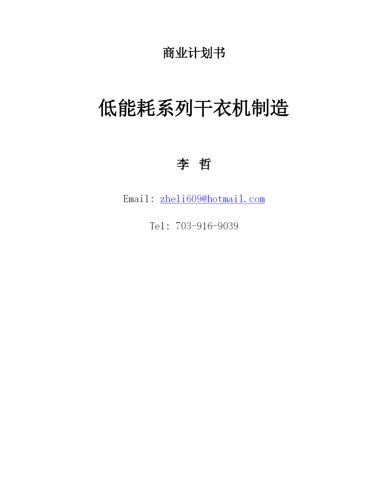 PAGEPAGE10商业计划书低能耗系列干衣机制造李哲Email:HYPERLINK"mailto:zheli609@hotmail.com"zheli609@hotmail.comTel:703-916-9039一、项目摘要1。目的开发一种低能耗干衣机技术。其各项性能大幅度超越现有干衣机技术。利用这个技术制造的干衣机(滚筒式和柜式干衣机),具有低能耗和高性价比的特点,可广泛应用与各种家庭和商业用户,有极为广阔的市场前景。2。市场机会现有干衣机的技术水平很低,都采用相似的很简单技术,导致