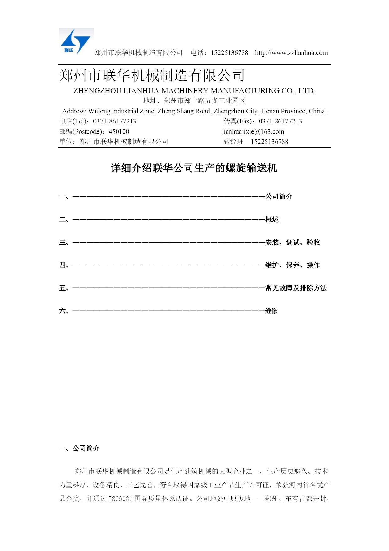 郑州市联华机械制造有限公司电话:15225136788http://www.zzlianhua.com郑州市联华机械制造有限公司ZHENGZHOULIANHUAMACHINERYMANUFACTURINGCO.,LTD.地址:郑州市郑上路五龙工业园区Address:WulongIndustrialZone,ZhengShangRoad,ZhengzhouCity,HenanProvince,China.电话(Tel):0371-86177213传真(Fax):0371-86177213邮编(Postcod