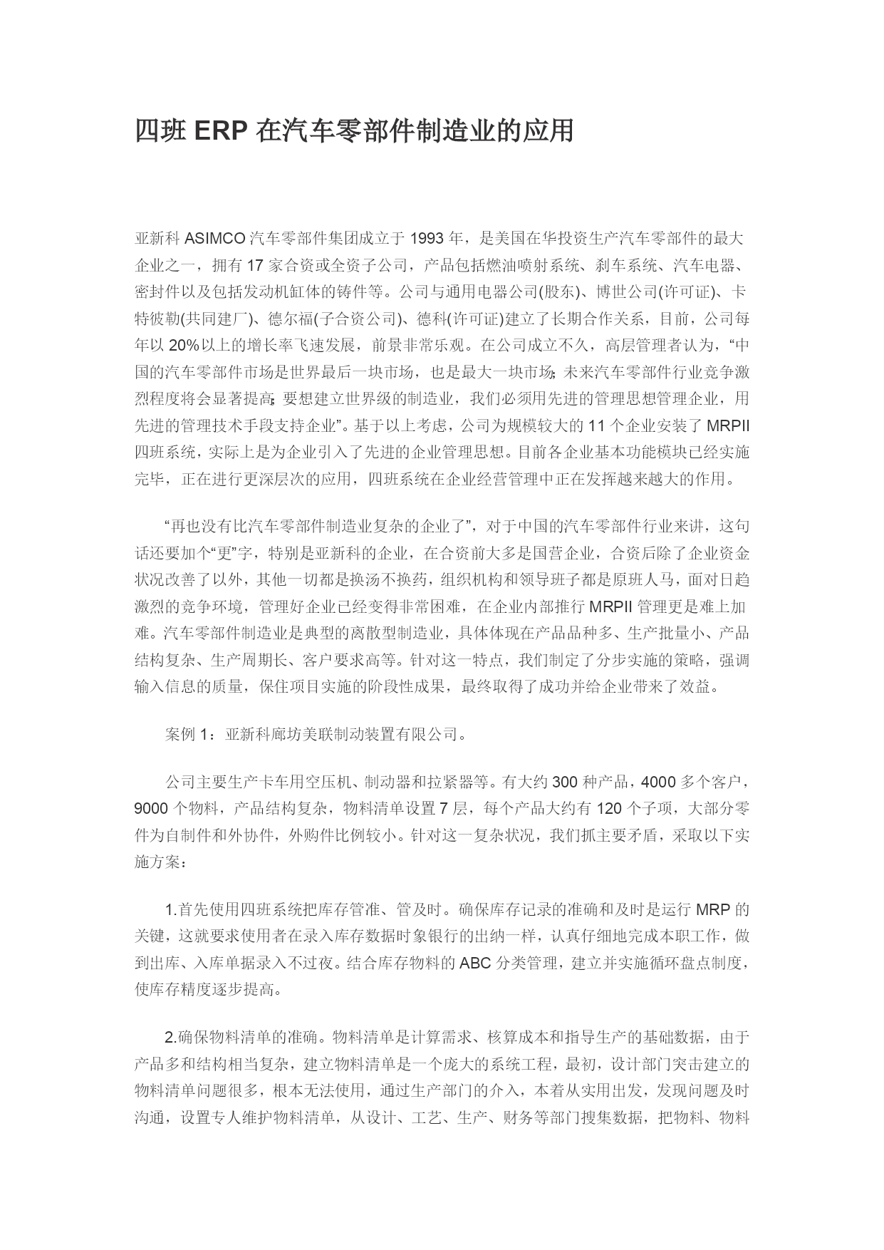 四班ERP在汽车零部件制造业的应用亚新科ASIMCO汽车零部件集团成立于1993年,是美国在华投资生产汽车零部件的最大企业之一,拥有17家合资或全资子公司,产品包括燃油喷射系统、刹车系统、汽车电器、密封件以及包括发动机缸体的铸件等。公司与通用电器公司(股东)、博世公司(许可证)、卡特彼勒(共同建厂)、德尔福(子合资公司)、德科(许可证)建立了长期合作关系,目前,公司每年以20%以上的增长率飞速发展,前景非常乐观。在公司成立不久,高层管理者认为,“中国的汽车零部件市场是世界最后一块市场,也是最大一块市场;未