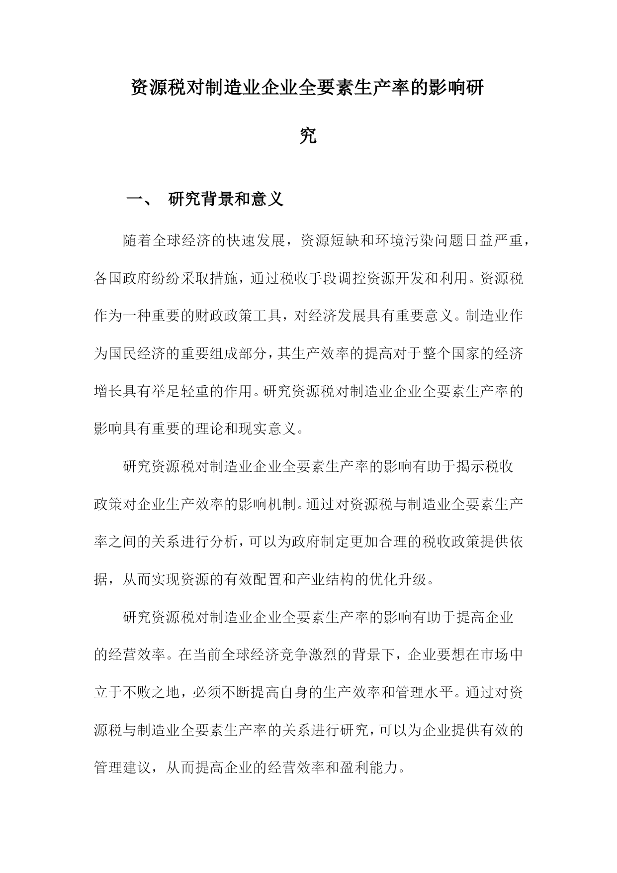 资源税对制造业企业全要素生产率的影响研究一、研究背景和意义随着全球经济的快速发展,资源短缺和环境污染问题日益严重,各国政府纷纷采取措施,通过税收手段调控资源开发和利用。资源税作为一种重要的财政政策工具,对经济发展具有重要意义。制造业作为国民经济的重要组成部分,其生产效率的提高对于整个国家的经济增长具有举足轻重的作用。研究资源税对制造业企业全要素生产率的影响具有重要的理论和现实意义。研究资源税对制造业企业全要素生产率的影响有助于揭示税收政策对企业生产效率的影响机制。通过对资源税与制造业全要素生产率之间的关系