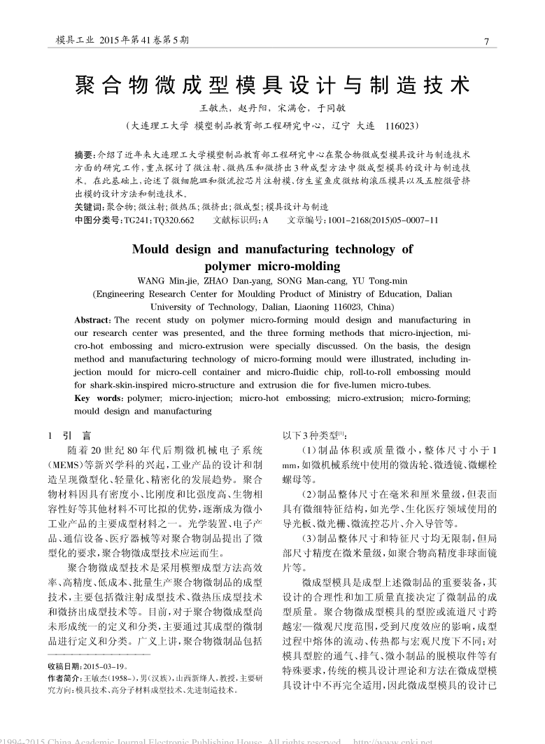 模具工业年第卷第期20154157聚合物微成型模具设计与制造技术王敏杰,赵丹阳,宋满仓,于同敏(大连理工大学模塑制品教育部工程研究中心,辽宁大连)116023摘要:介绍了近年来大连理工大学模塑制品教育部工程研究中心在聚合物微成型模具设计与制造技术方面的研究工作,重点探讨了微注射、微热压和微挤出种成型方法中微成型模具的设计与制造技3术。在此基础上,论述了微细胞皿和微流控芯片注射模、仿生鲨鱼皮微结构滚压模具以及五腔微管挤出模的设计方法和制造技术。关键词:聚合物;微注射;微热压;微挤出;微成型;模具设计与制造中