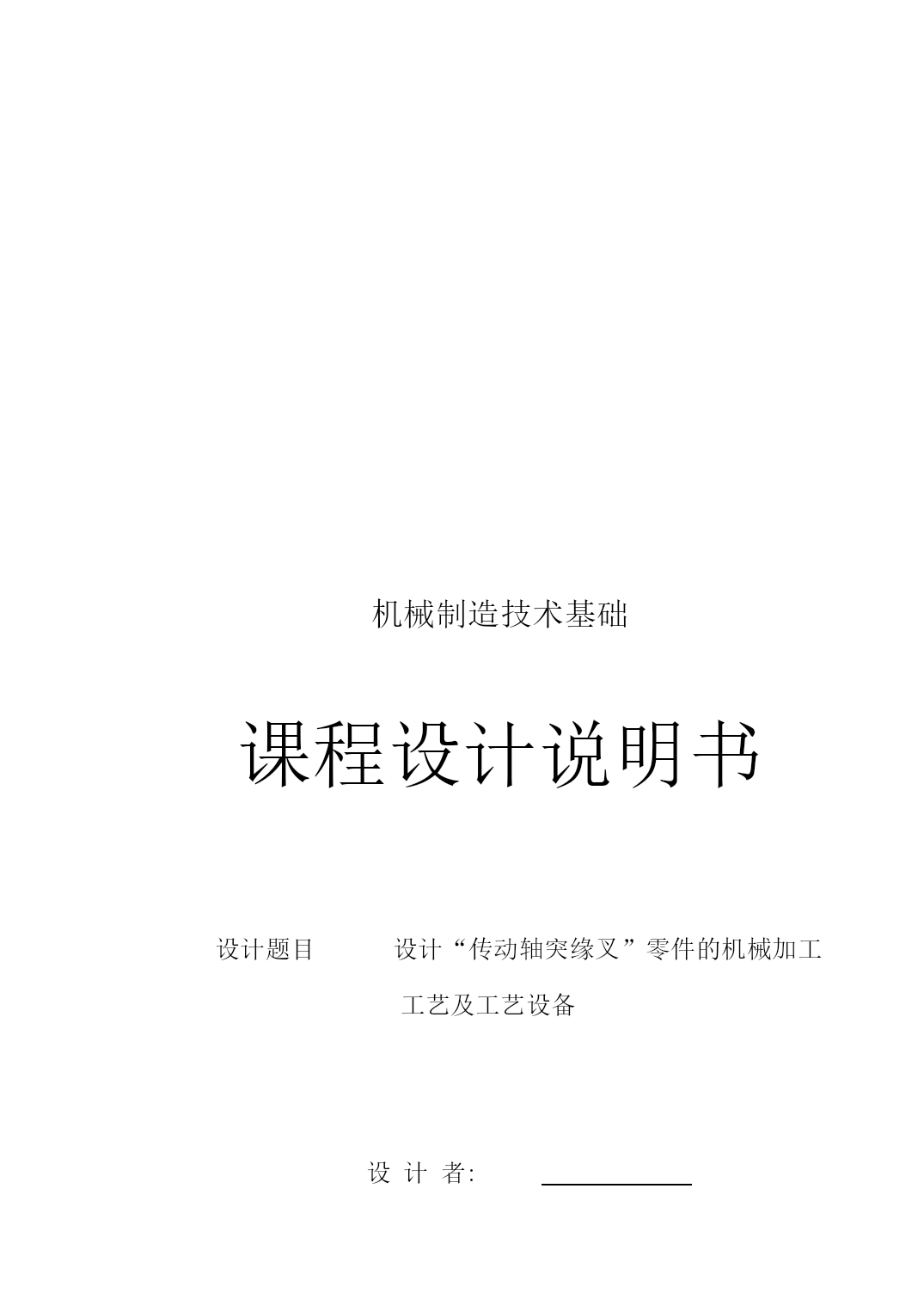 HYPERLINK""机械制造技术基础课程设计说明书设计题目设计“传动轴突缘叉”零件的机械加工工艺及工艺设备设计者:指导教师:太原理工大学阳泉学院20**.7~20**.8机械制造技术基础课程设计任务书题目:设计“传动轴突缘叉”零件的机械加工工艺规则及工艺装备内容:1.零件图1张2.毛坯图1张3.机械加工工艺过程综合卡片1张4.夹具结构设计装配图1张5.夹具结构设计零件图1张6.课程设计说明书1份谢谢朋友对我文章的赏识,充值后就可以下载说明书。我这里还有一个压缩包,里面有相应的word说明书和CAD