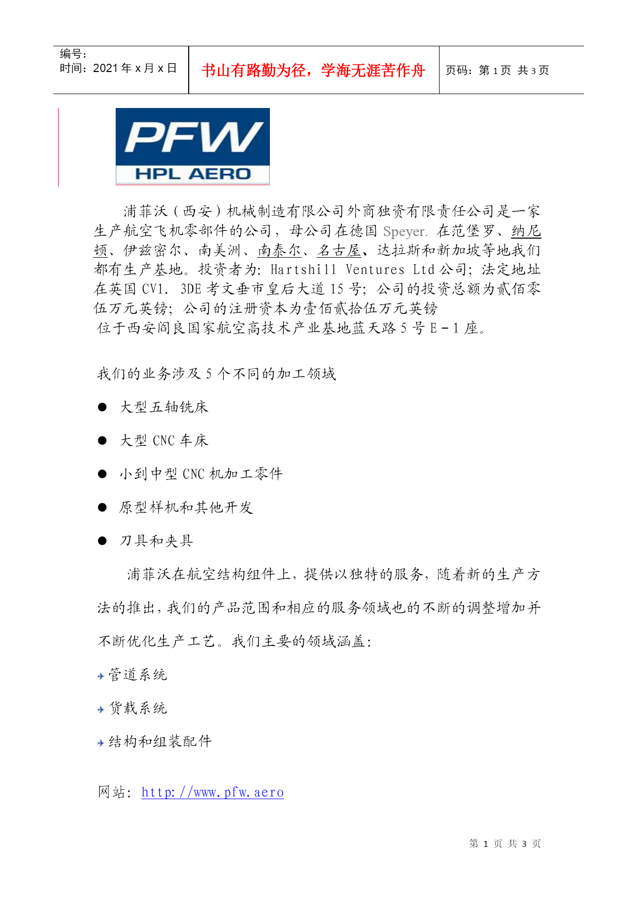 编号:时间:2021年x月x日书山有路勤为径,学海无涯苦作舟页码:第PAGE3页共NUMPAGES3页第PAGE\*MERGEFORMAT3页共NUMPAGES\*MERGEFORMAT3页浦菲沃(西安)机械制造有限公司外商独资有限责任公司是一家生产航空飞机零部件的公司,母公司在德国Speyer.在范堡罗、HYPERLINK"http://dict.cnki.net/dict_result.aspx?searchword=Nuneaton&tjType=sentence&styl