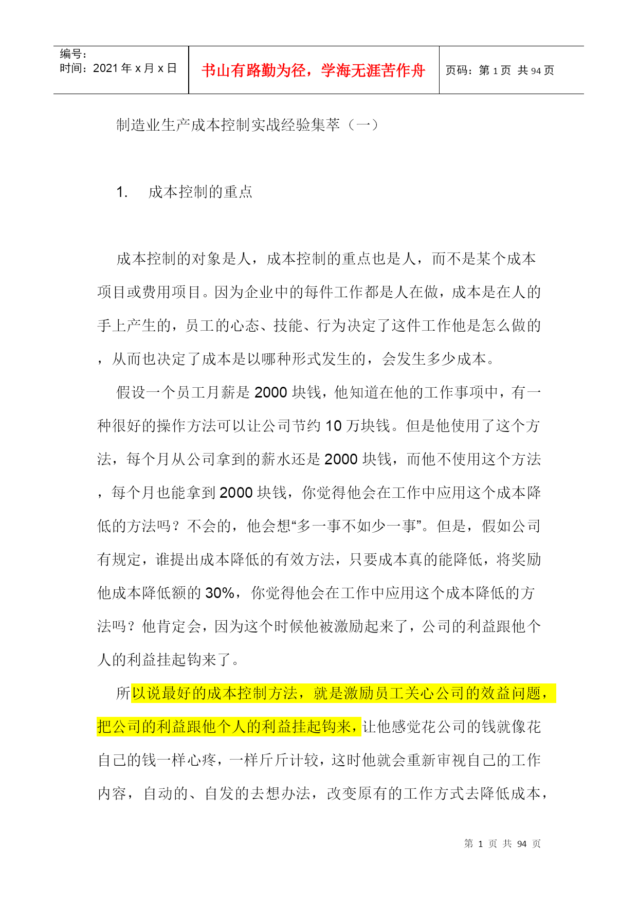 编号:时间:2021年x月x日书山有路勤为径,学海无涯苦作舟页码:第PAGE94页共NUMPAGES94页第PAGE\*MERGEFORMAT94页共NUMPAGES\*MERGEFORMAT94页制造业生产成本控制实战经验集萃(一)1.成本控制的重点成本控制的对象是人,成本控制的重点也是人,而不是某个成本项目或费用项目。因为企业中的每件工作都是人在做,成本是在人的手上产生的,员工的心态、技能HYPERLINK""、行为决定了这件工作他是怎么做的,从而也决定了成本是以哪种形式