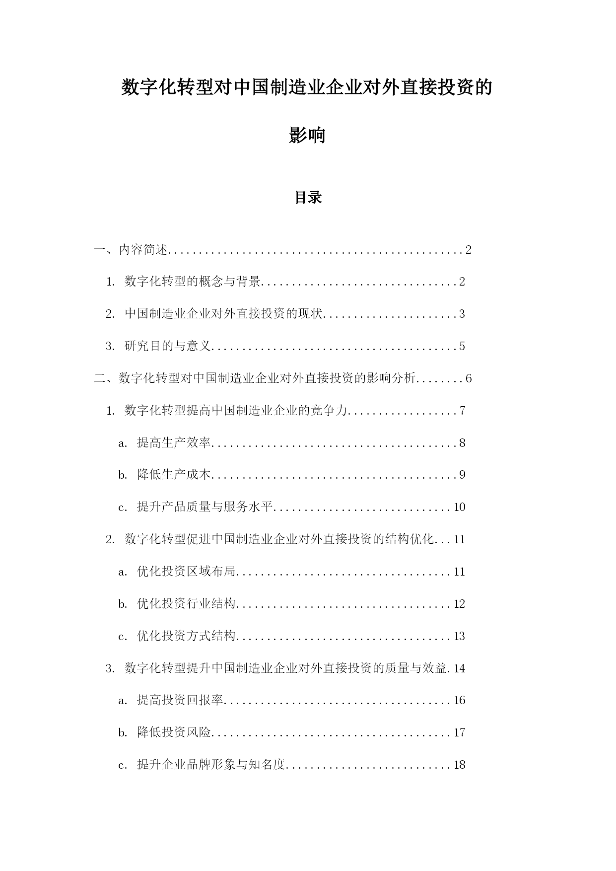 数字化转型对中国制造业企业对外直接投资的影响目录一、内容简述................................................21.数字化转型的概念与背景................................22.中国制造业企业对外直接投资的现状......................33.研究目的与意义........................................5二、数字化转型对中国制造业企业对外直接投资的影响分析........61.数字