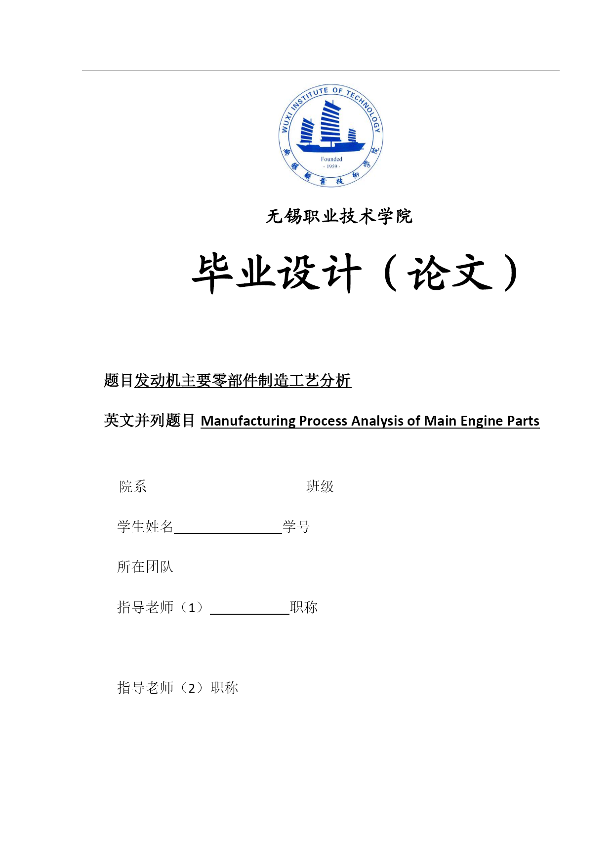 无锡职业技术学院毕业设计(论文)题目发动机主要零部件制造工艺分析英文并列题目ManufacturingProcessAnalysisofMainEngineParts院系班级学生姓名学号所在团队指导老师(1)职称指导老师(2)职称答辩委员会主任主答辩人二零一八年二月无锡职业技术学院毕业设计(论文)说明书发动机主要零部件制造工艺分析摘要:第19次国民会议的成功招集,中国成功进入了社会主义的新时代。经济增长由追求高速度、追求高品质、为中国国家宏伟复活打下坚实的基础转变而来。中国现在的经济快速发展,汽车行业的零