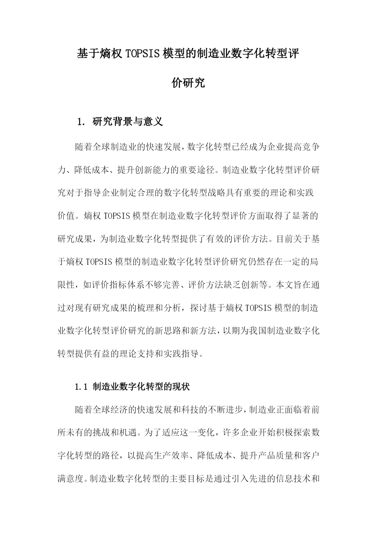基于熵权TOPSIS模型的制造业数字化转型评价研究1.研究背景与意义随着全球制造业的快速发展,数字化转型已经成为企业提高竞争力、降低成本、提升创新能力的重要途径。制造业数字化转型评价研究对于指导企业制定合理的数字化转型战略具有重要的理论和实践价值。熵权TOPSIS模型在制造业数字化转型评价方面取得了显著的研究成果,为制造业数字化转型提供了有效的评价方法。目前关于基于熵权TOPSIS模型的制造业数字化转型评价研究仍然存在一定的局限性,如评价指标体系不够完善、评价方法缺乏创新等。本文旨在通过对现有研究成果的梳