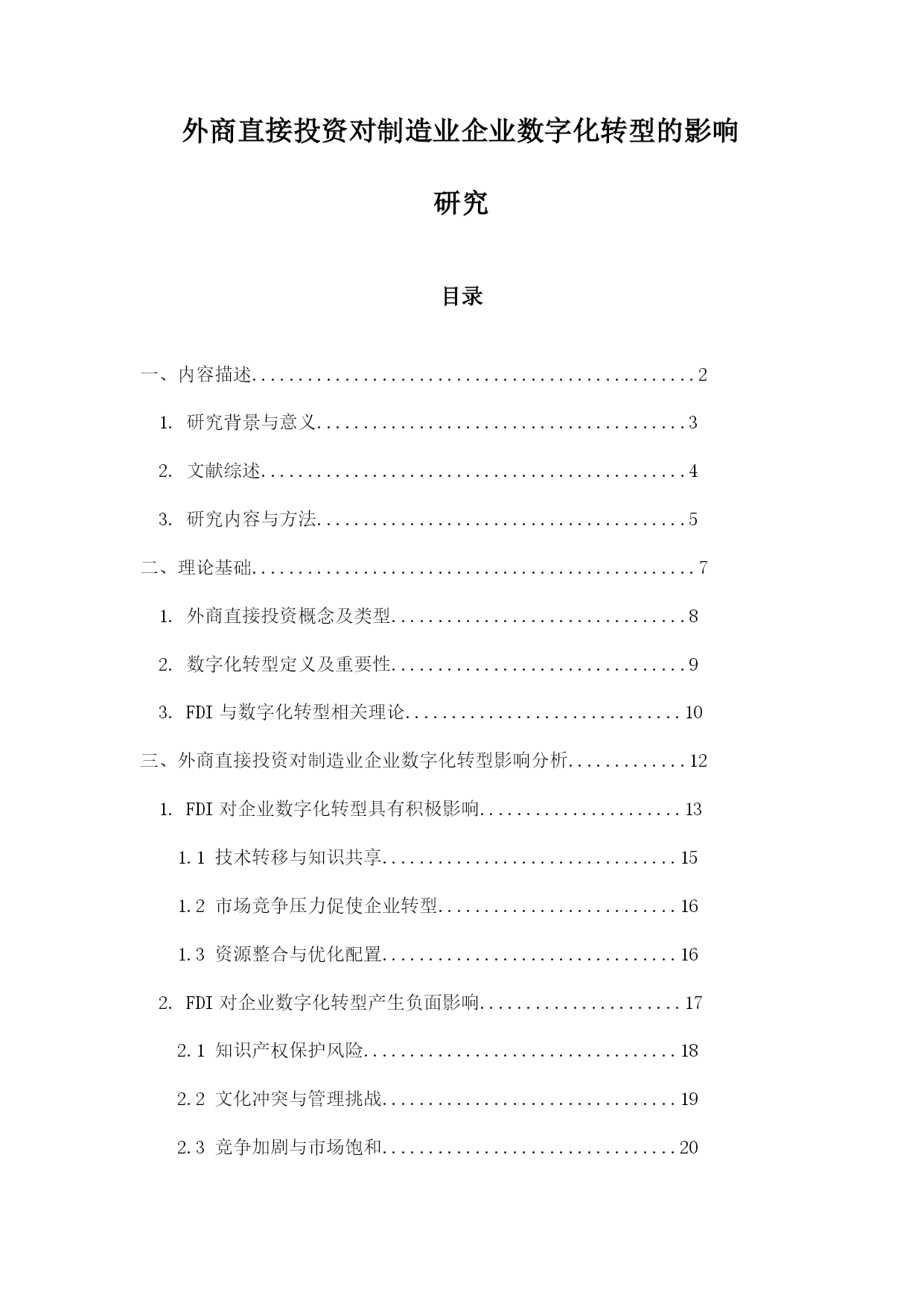 外商直接投资对制造业企业数字化转型的影响研究目录一、内容描述................................................21.研究背景与意义........................................32.文献综述..............................................43.研究内容与方法........................................5二、理论基础.................