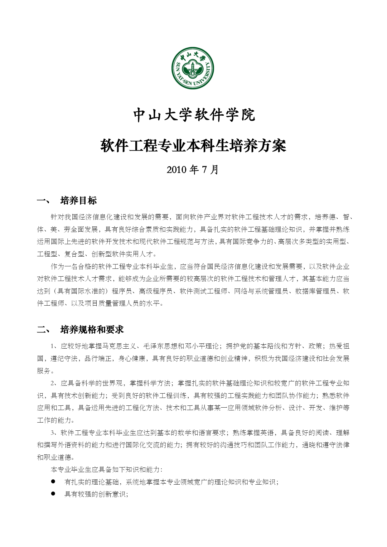 编号:时间:2021年x月x日书山有路勤为径,学海无涯苦作舟页码:第PAGE7页共NUMPAGES7页第PAGE\*MERGEFORMAT7页共NUMPAGES\*MERGEFORMAT7页中山大学软件学院软件工程专业本科生培养方案2010年7月培养目标针对我国经济信息化建设和发展的需要,面向软件产业界对软件工程技术人才的需求,培养德、智、体、美、劳全面发展,具有良好综合素质和实践能力,具备扎实的软件工程基础理论知识,并掌握并熟练运用国际上先进的软件开发技术和现代软件工程规范与方法