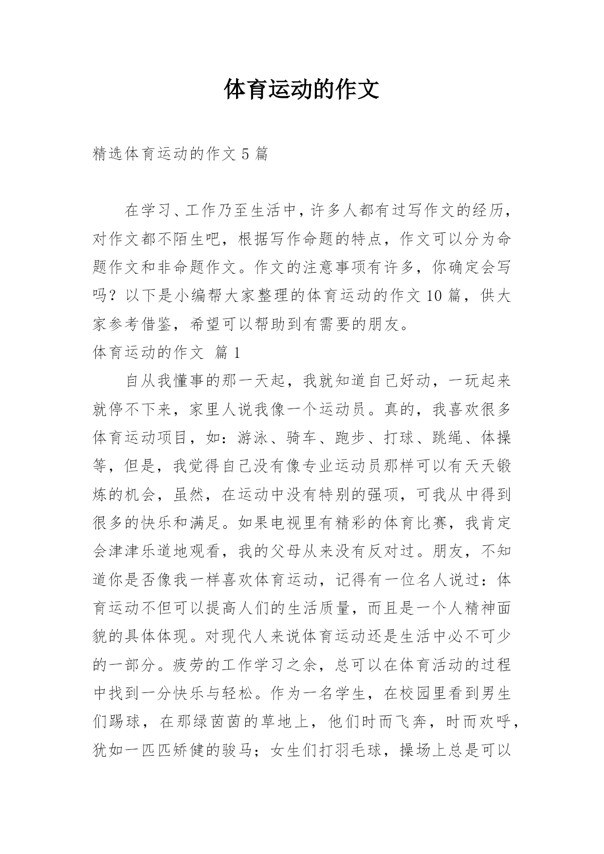 体育运动的作文精选体育运动的作文5篇在学习、工作乃至生活中,许多人都有过写作文的经历,对作文都不陌生吧,根据写作命题的特点,作文可以分为命题作文和非命题作文。作文的注意事项有许多,你确定会写吗?以下是小编帮大家整理的体育运动的作文10篇,供大家参考借鉴,希望可以帮助到有需要的朋友。体育运动的作文篇1自从我懂事的那一天起,我就知道自己好动,一玩起来就停不下来,家里人说我像一个运动员。真的,我喜欢很多体育运动项目,如:游泳、骑车、跑步、打球、跳绳、体操等,但是,我觉得自己没有像专业运动员那样可以有天天锻炼的机