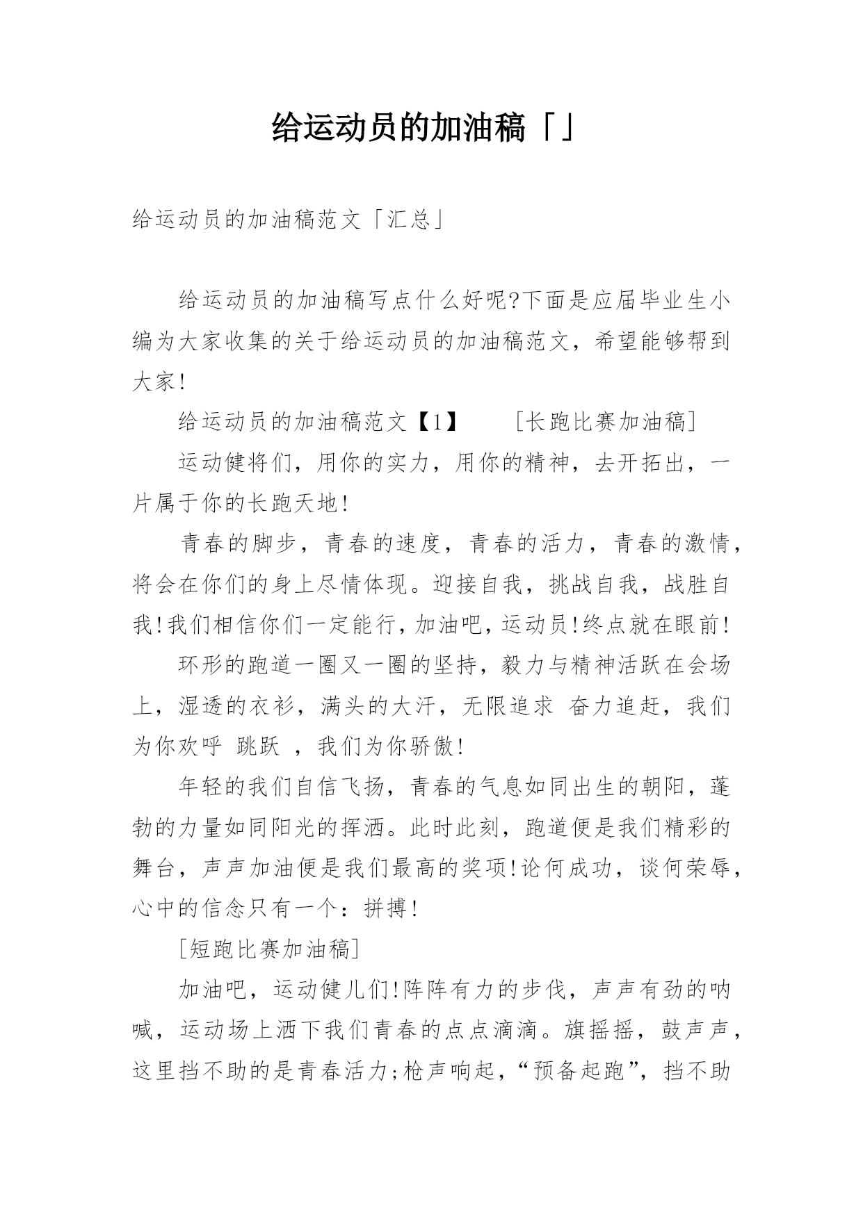 给运动员的加油稿「」给运动员的加油稿范文「汇总」给运动员的加油稿写点什么好呢?下面是应届毕业生小编为大家收集的关于给运动员的加油稿范文,希望能够帮到大家!给运动员的加油稿范文【1】[长跑比赛加油稿]运动健将们,用你的实力,用你的精神,去开拓出,一片属于你的长跑天地!青春的脚步,青春的速度,青春的活力,青春的激情,将会在你们的身上尽情体现。迎接自我,挑战自我,战胜自我!我们相信你们一定能行,加油吧,运动员!终点就在眼前!环形的跑道一圈又一圈的坚持,毅力与精神活跃在会场上,湿透的衣衫,满头的大汗,无限追求奋力