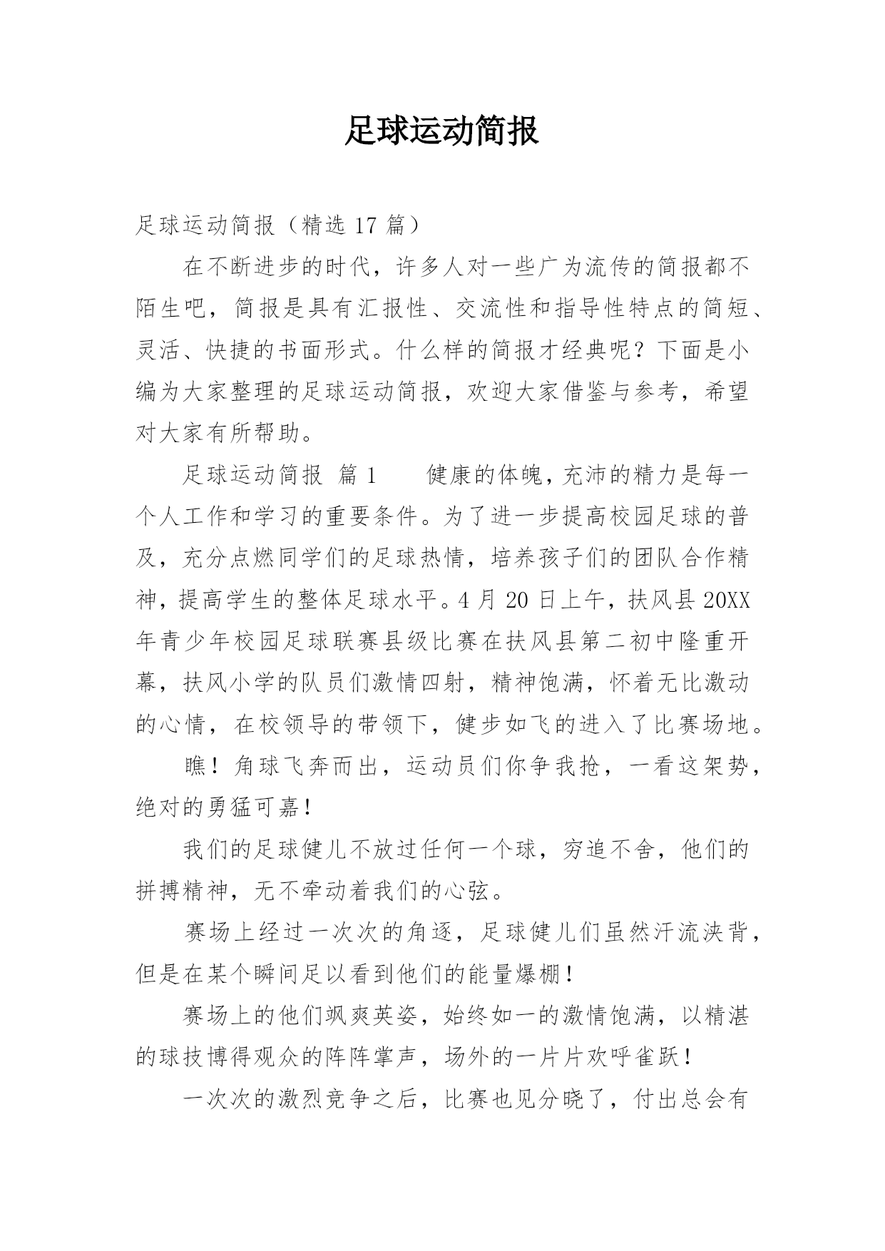 足球运动简报足球运动简报(精选17篇)在不断进步的时代,许多人对一些广为流传的简报都不陌生吧,简报是具有汇报性、交流性和指导性特点的简短、灵活、快捷的书面形式。什么样的简报才经典呢?下面是小编为大家整理的足球运动简报,欢迎大家借鉴与参考,希望对大家有所帮助。足球运动简报篇1健康的体魄,充沛的精力是每一个人工作和学习的重要条件。为了进一步提高校园足球的普及,充分点燃同学们的足球热情,培养孩子们的团队合作精神,提高学生的整体足球水平。4月20日上午,扶风县20XX年青少年校园足球联赛县级比赛在扶风县第二初中隆