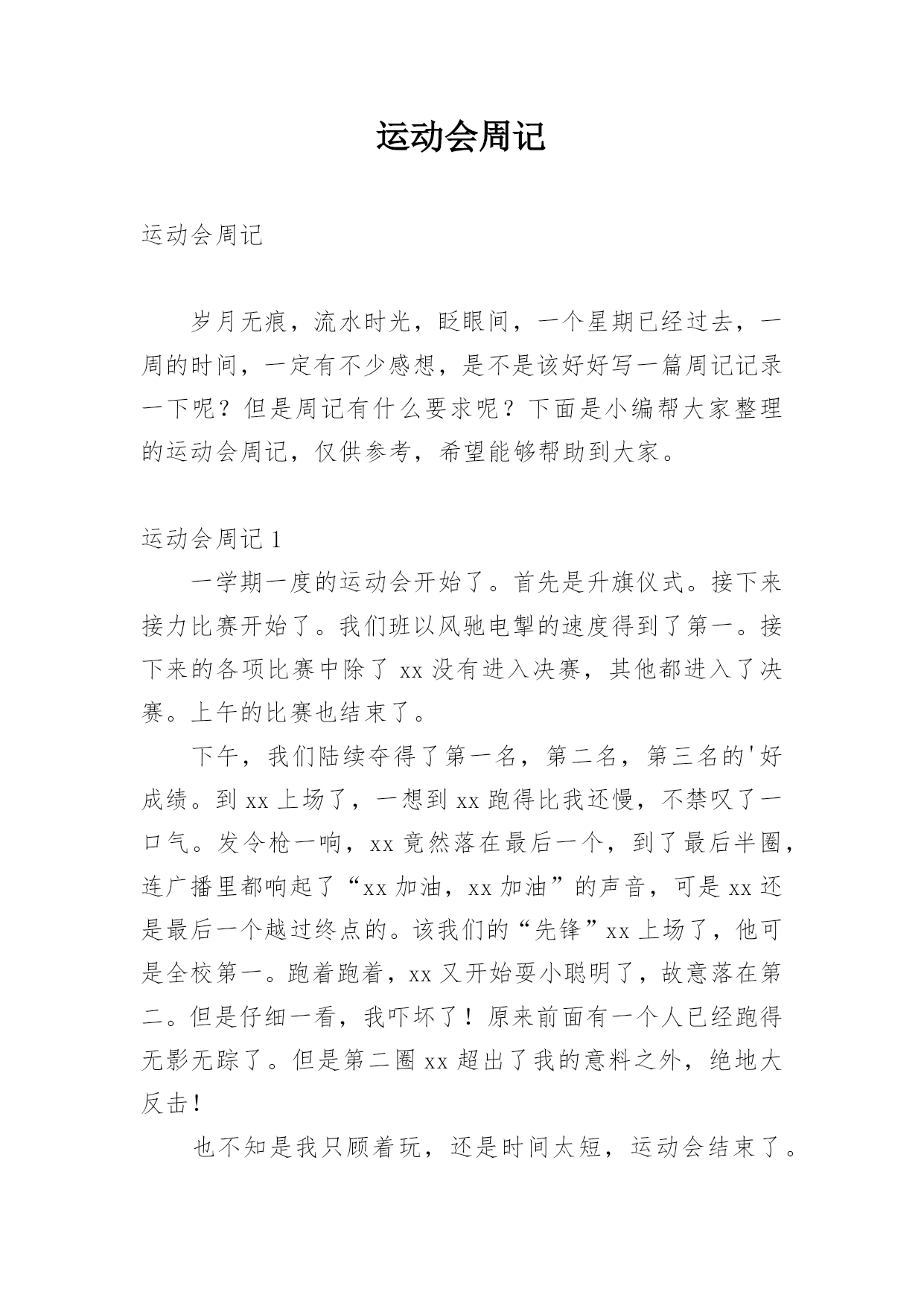 运动会周记运动会周记岁月无痕,流水时光,眨眼间,一个星期已经过去,一周的时间,一定有不少感想,是不是该好好写一篇周记记录一下呢?但是周记有什么要求呢?下面是小编帮大家整理的运动会周记,仅供参考,希望能够帮助到大家。运动会周记1一学期一度的运动会开始了。首先是升旗仪式。接下来接力比赛开始了。我们班以风驰电掣的速度得到了第一。接下来的各项比赛中除了xx没有进入决赛,其他都进入了决赛。上午的比赛也结束了。下午,我们陆续夺得了第一名,第二名,第三名的'好成绩。到xx上场了,一想到xx跑得比我还慢,不禁叹了一口气。