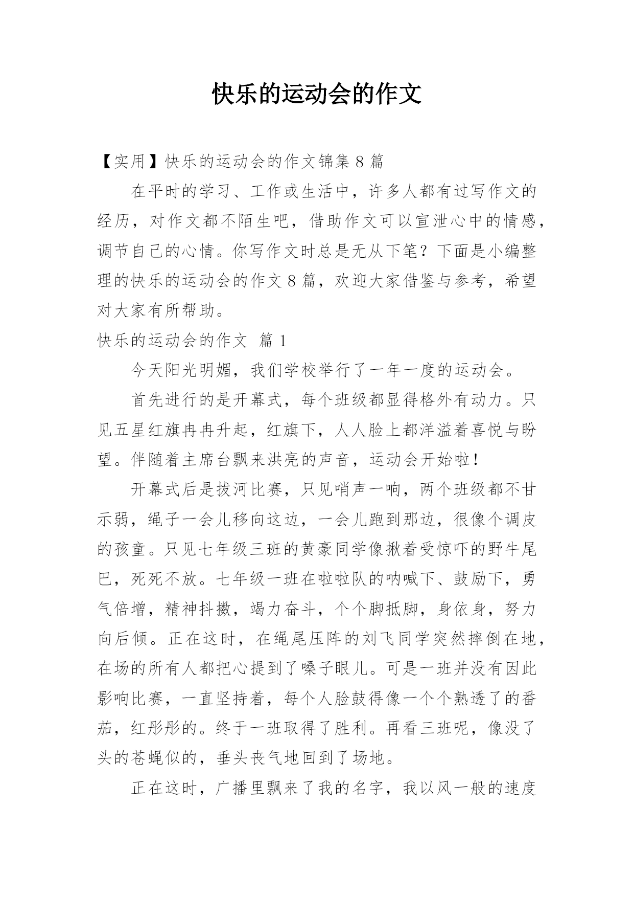 快乐的运动会的作文【实用】快乐的运动会的作文锦集8篇在平时的学习、工作或生活中,许多人都有过写作文的经历,对作文都不陌生吧,借助作文可以宣泄心中的情感,调节自己的心情。你写作文时总是无从下笔?下面是小编整理的快乐的运动会的作文8篇,欢迎大家借鉴与参考,希望对大家有所帮助。快乐的运动会的作文篇1今天阳光明媚,我们学校举行了一年一度的运动会。首先进行的是开幕式,每个班级都显得格外有动力。只见五星红旗冉冉升起,红旗下,人人脸上都洋溢着喜悦与盼望。伴随着主席台飘来洪亮的声音,运动会开始啦!开幕式后是拔河比赛,只见