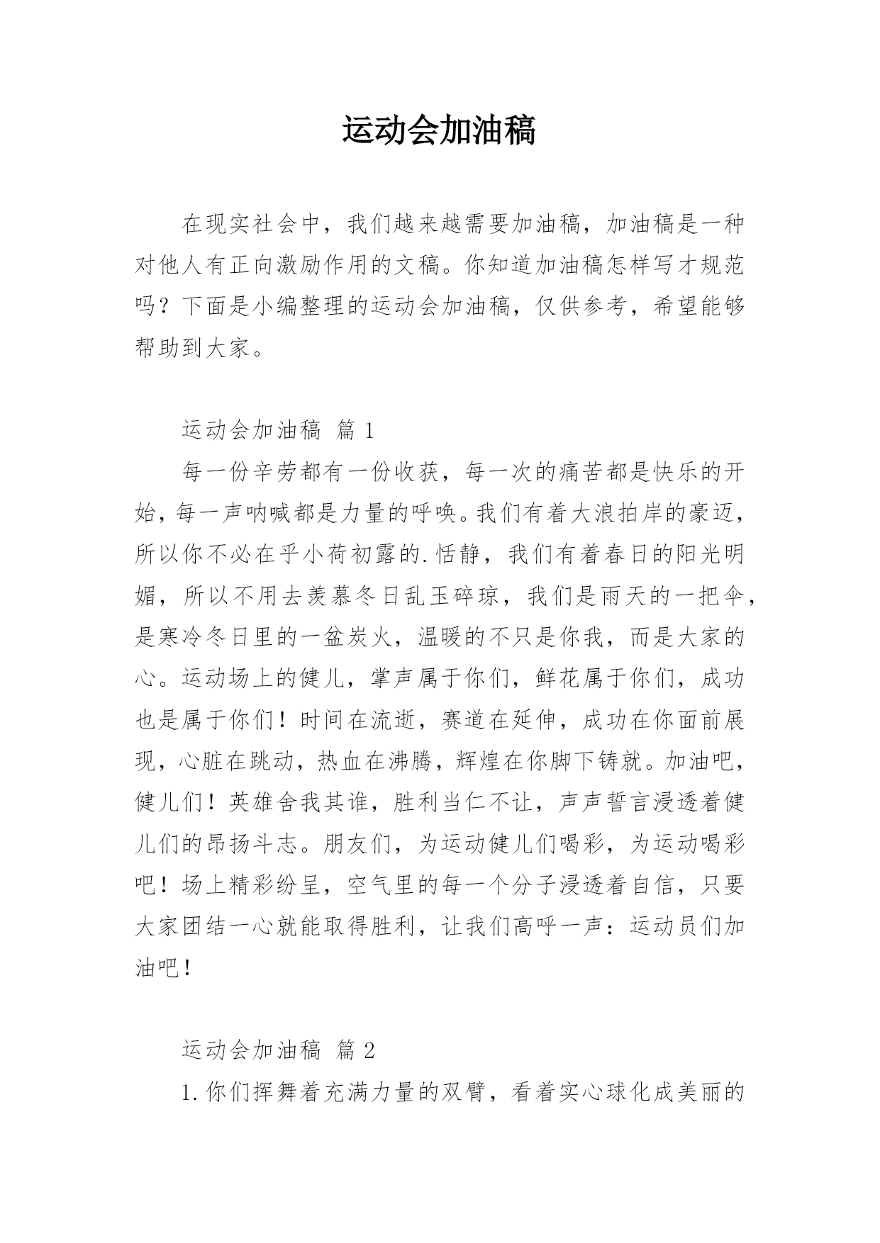 运动会加油稿在现实社会中,我们越来越需要加油稿,加油稿是一种对他人有正向激励作用的文稿。你知道加油稿怎样写才规范吗?下面是小编整理的运动会加油稿,仅供参考,希望能够帮助到大家。运动会加油稿篇1每一份辛劳都有一份收获,每一次的痛苦都是快乐的开始,每一声呐喊都是力量的呼唤。我们有着大浪拍岸的豪迈,所以你不必在乎小荷初露的.恬静,我们有着春日的阳光明媚,所以不用去羡慕冬日乱玉碎琼,我们是雨天的一把伞,是寒冷冬日里的一盆炭火,温暖的不只是你我,而是大家的心。运动场上的健儿,掌声属于你们,鲜花属于你们,成功也是属于