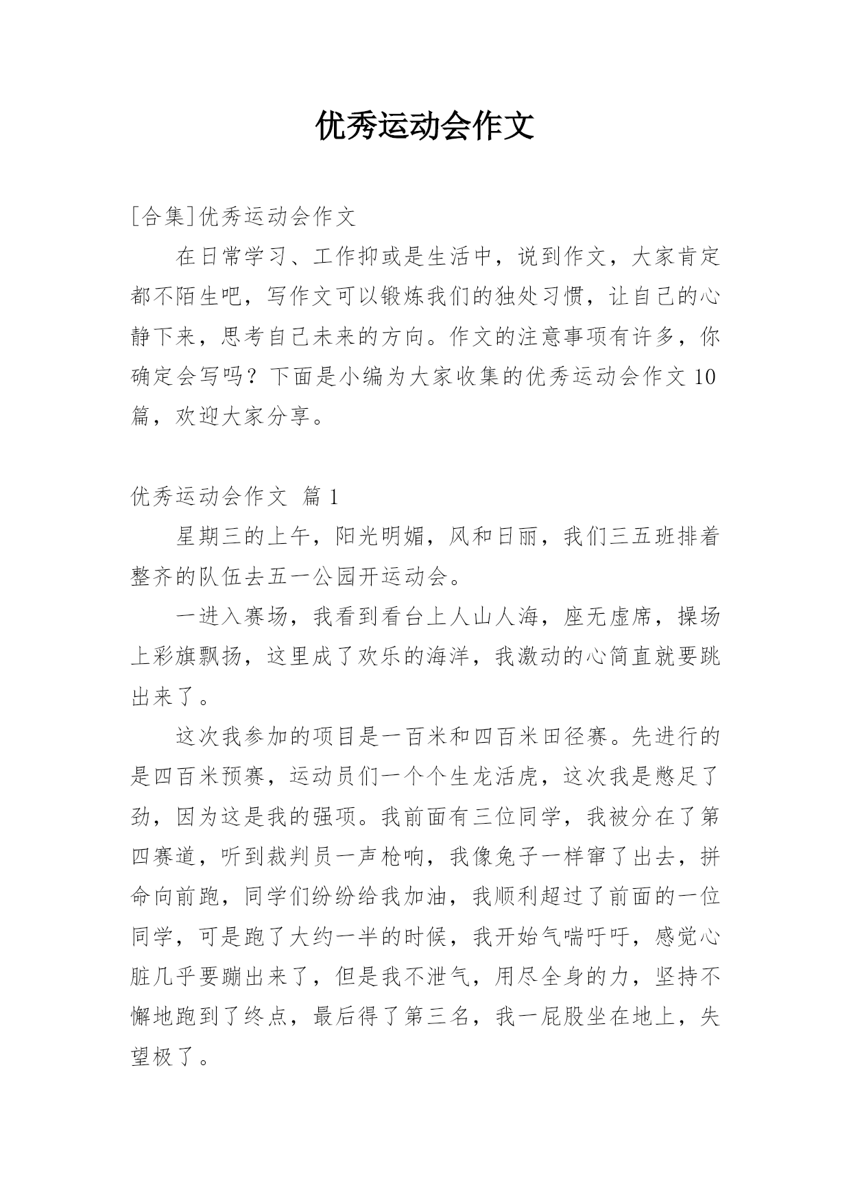 优秀运动会作文[合集]优秀运动会作文在日常学习、工作抑或是生活中,说到作文,大家肯定都不陌生吧,写作文可以锻炼我们的独处习惯,让自己的心静下来,思考自己未来的方向。作文的注意事项有许多,你确定会写吗?下面是小编为大家收集的优秀运动会作文10篇,欢迎大家分享。优秀运动会作文篇1星期三的上午,阳光明媚,风和日丽,我们三五班排着整齐的队伍去五一公园开运动会。一进入赛场,我看到看台上人山人海,座无虚席,操场上彩旗飘扬,这里成了欢乐的海洋,我激动的心简直就要跳出来了。这次我参加的项目是一百米和四百米田径赛。先进行的