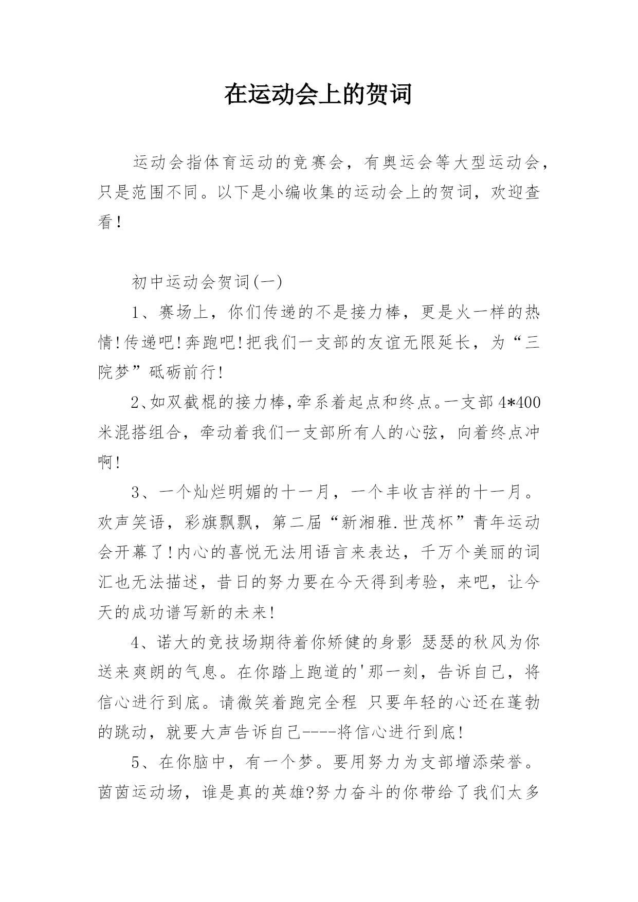 在运动会上的贺词运动会指体育运动的竞赛会,有奥运会等大型运动会,只是范围不同。以下是小编收集的运动会上的贺词,欢迎查看!初中运动会贺词(一)1、赛场上,你们传递的不是接力棒,更是火一样的热情!传递吧!奔跑吧!把我们一支部的友谊无限延长,为“三院梦”砥砺前行!2、如双截棍的接力棒,牵系着起点和终点。一支部4*400米混搭组合,牵动着我们一支部所有人的心弦,向着终点冲啊!3、一个灿烂明媚的十一月,一个丰收吉祥的十一月。欢声笑语,彩旗飘飘,第二届“新湘雅.世茂杯”青年运动会开幕了!内心的喜悦无法用语言来表达,千