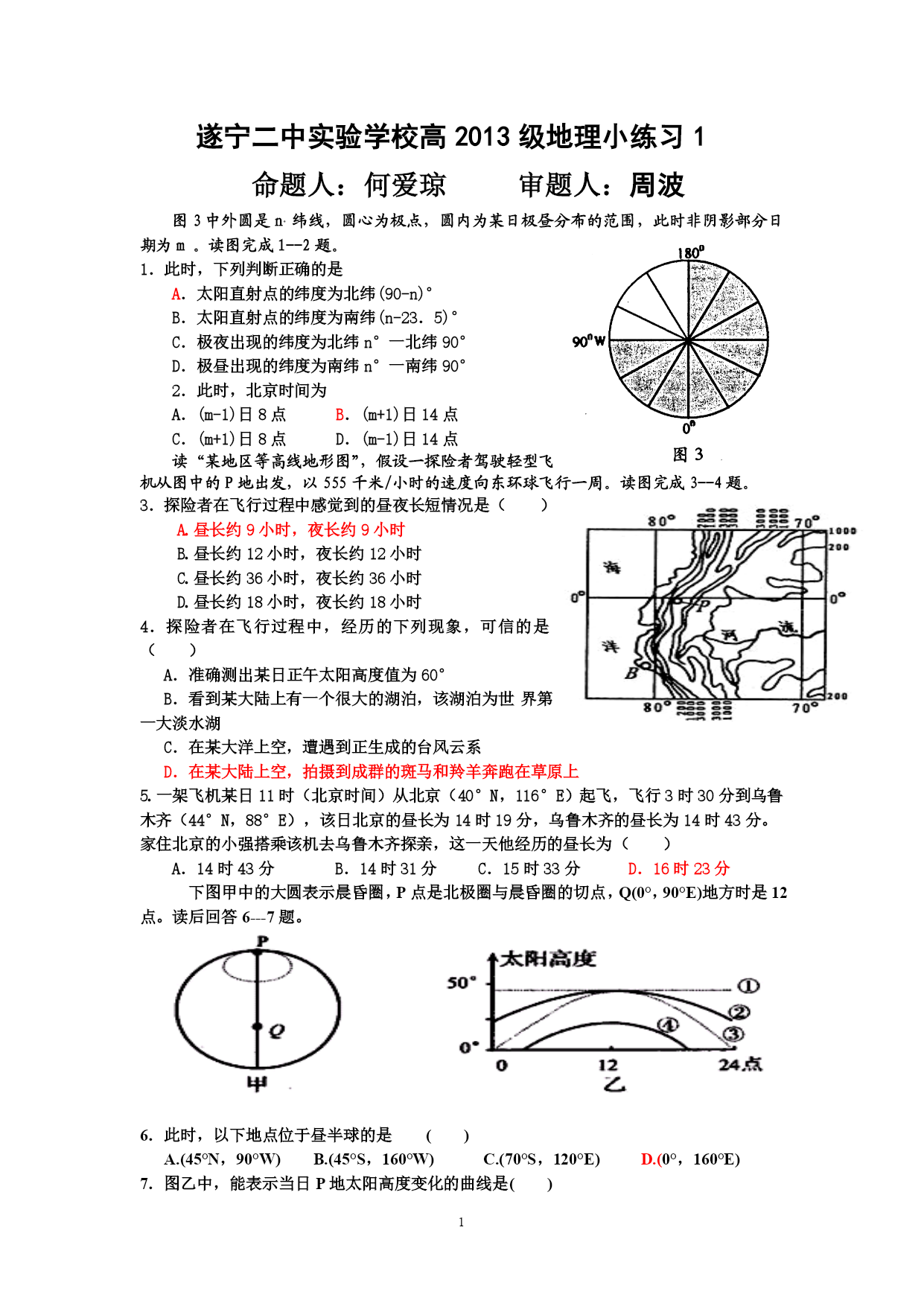 PAGEPAGE4遂宁二中实验学校高2013级地理小练习1命题人:何爱琼审题人:周波图3中外圆是n。纬线,圆心为极点,圆内为某日极昼分布的范围,此时非阴影部分日期为m。读图完成1--2题。1.此时,下列判断正确的是A.太阳直射点的纬度为北纬(90-n)°B.太阳直射点的纬度为南纬(n-23.5)°C.极夜出现的纬度为北纬n°一北纬90°D.极昼出现的纬度为南纬n°一南纬90°2.此时,北京时间为A.(m-1)日8点B.(m+1)日14点C.(m+1)日8点D.(m-1)日14点读“某地区等高线