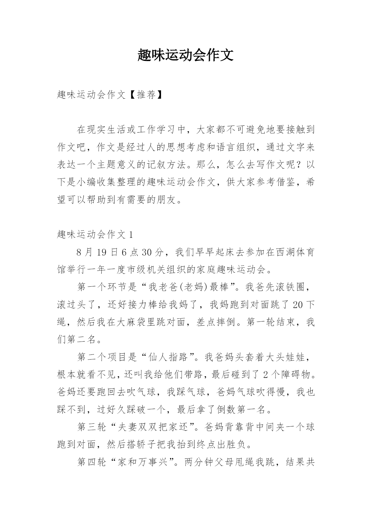 趣味运动会作文趣味运动会作文【推荐】在现实生活或工作学习中,大家都不可避免地要接触到作文吧,作文是经过人的思想考虑和语言组织,通过文字来表达一个主题意义的记叙方法。那么,怎么去写作文呢?以下是小编收集整理的趣味运动会作文,供大家参考借鉴,希望可以帮助到有需要的朋友。趣味运动会作文18月19日6点30分,我们早早起床去参加在西湖体育馆举行一年一度市级机关组织的家庭趣味运动会。第一个环节是“我老爸(老妈)最棒”。我爸先滚铁圈,滚过头了,还好接力棒给我妈了,我妈跑到对面跳了20下绳,然后我在大麻袋里跳对面,差点
